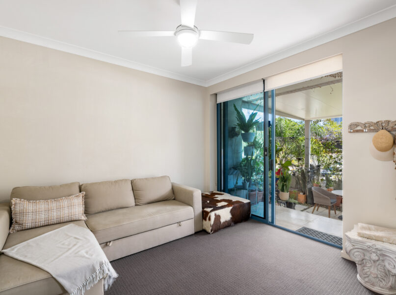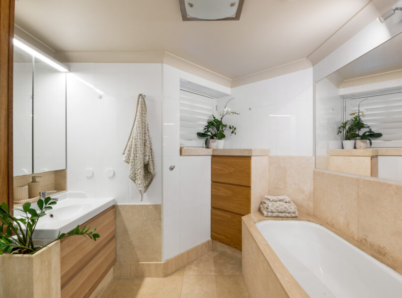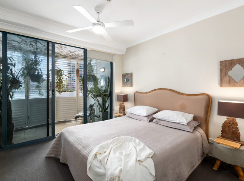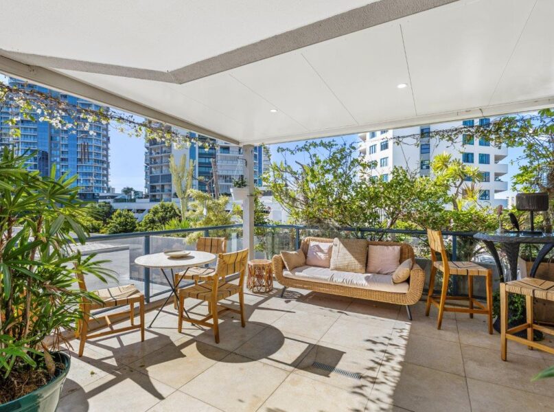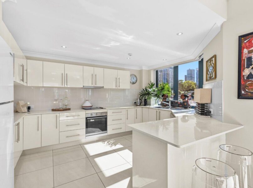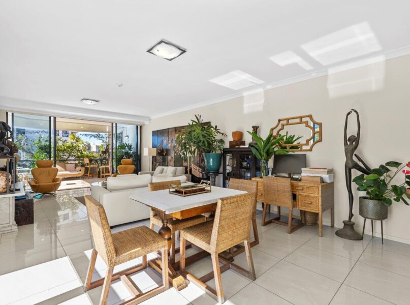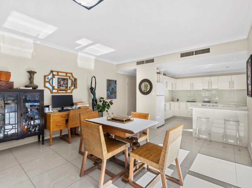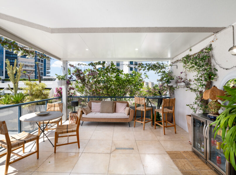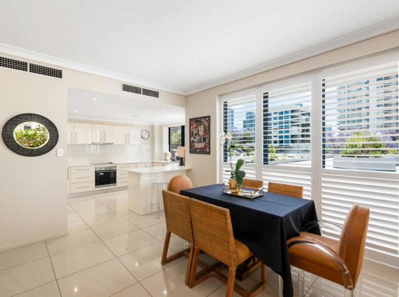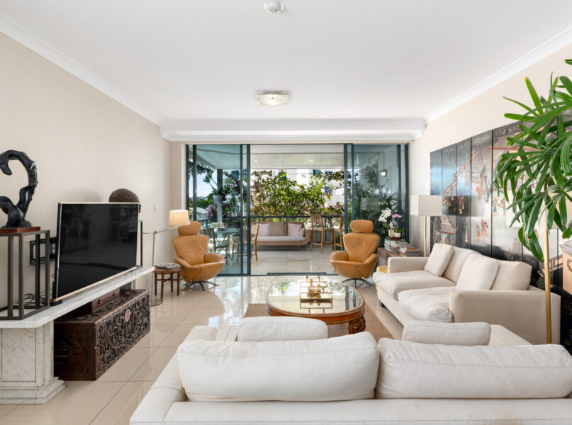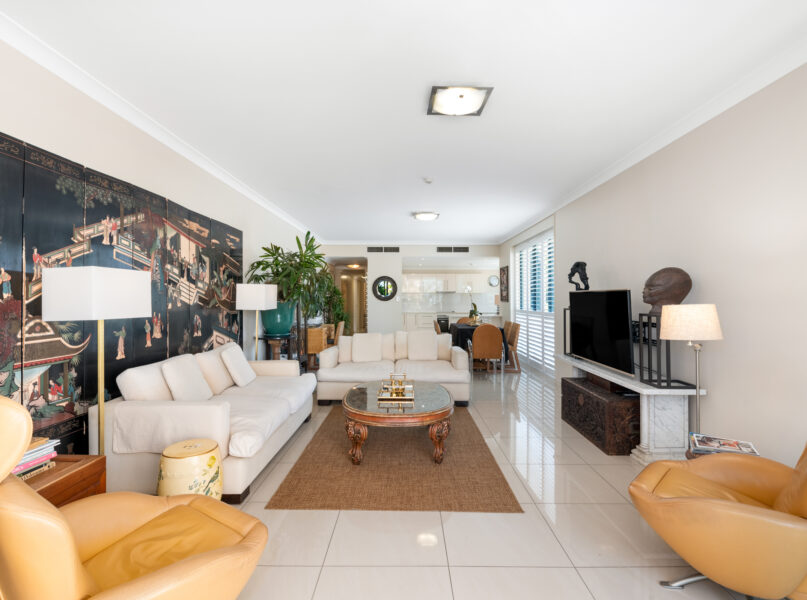 The apartment’s open and functional floor plan is designed with ease of living in mind, seamlessly blending style and functionality. The light-filled living area is adorned with beautiful Italian travertine tiling, upgraded for low maintenance and year-round comfort which opens onto both terraces, creating a beautiful cross breeze throughout.