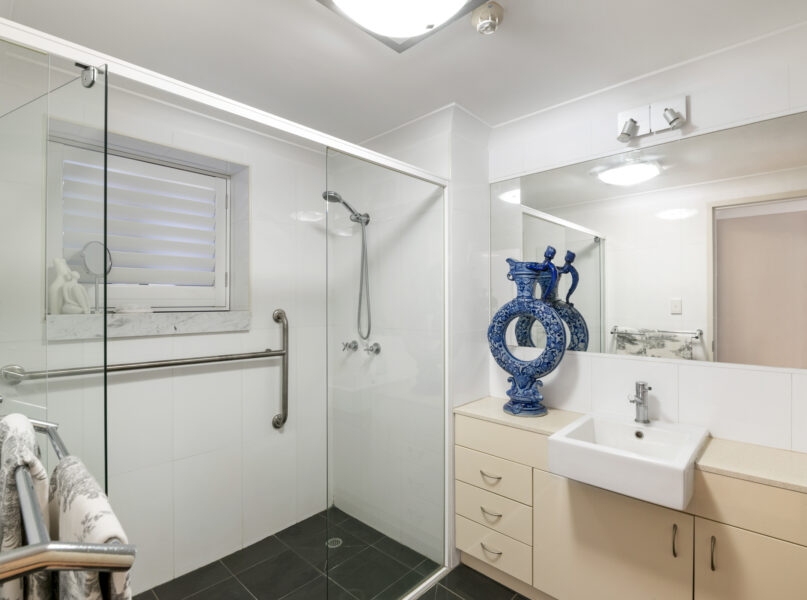 The main bathroom is thoughtfully designed, featuring modern finishes, a large shower and an integrated laundry. Throughout the apartment, high-quality blinds and shutters enhance the sleek and modern feel. Plantation shutters and Crimsafe security screens provide both privacy and security, while ducted air conditioning ensures optimal climate control.