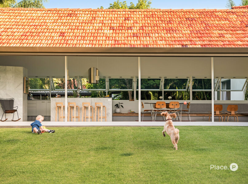 Accessed via a gated entry, the home showcases a striking facade crowned by a terracotta-tiled roof. Inside, a predominately concrete structure is softened by timber accents and louvered windows that welcome plentiful natural light into the property.