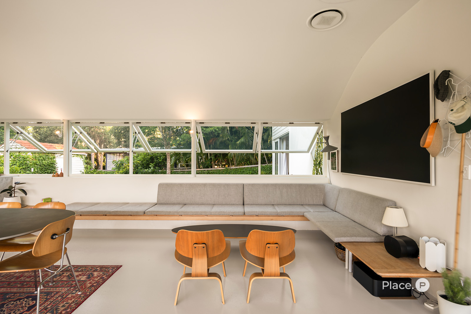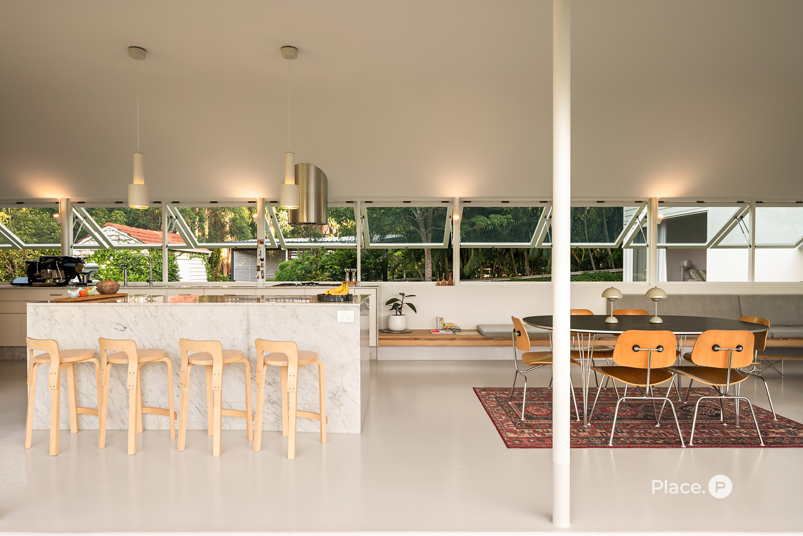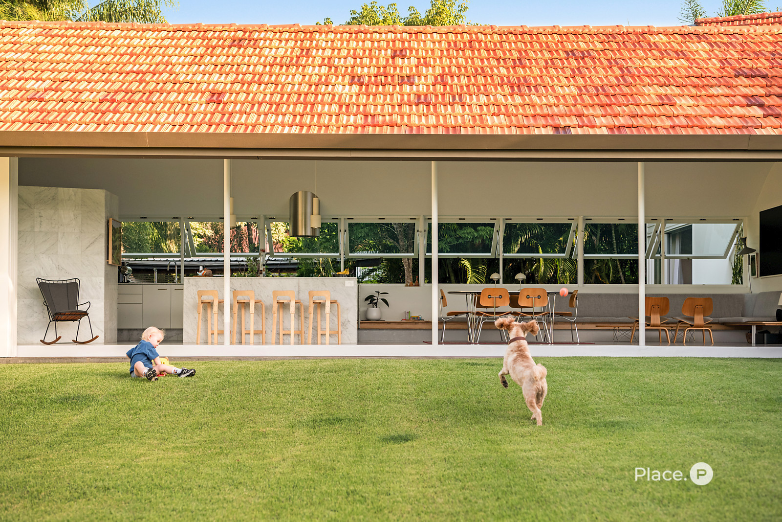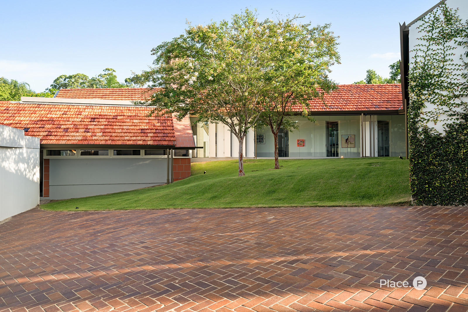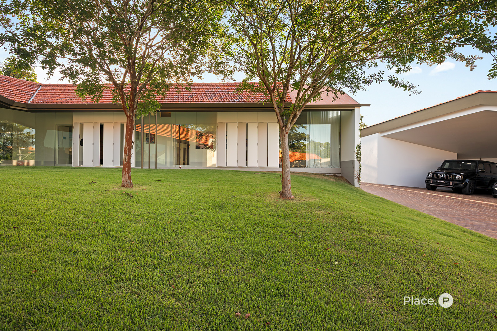 Accessed via a gated entry, the home showcases a striking facade crowned by a terracotta-tiled roof. Inside, a predominately concrete structure is softened by timber accents and louvered windows that welcome plentiful natural light into the property.