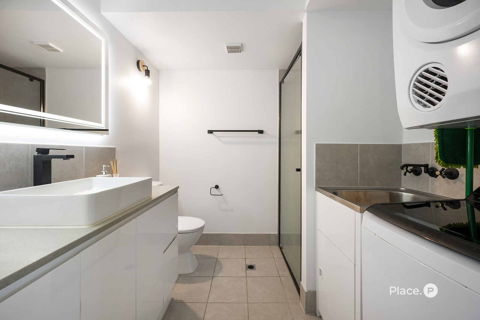 The functional kitchen offers ample bench space and storage, while both bedrooms are generously sized with built-in closets and direct access to a private outdoor terrace. The modern bathroom includes integrated laundry facilities for added practicality.