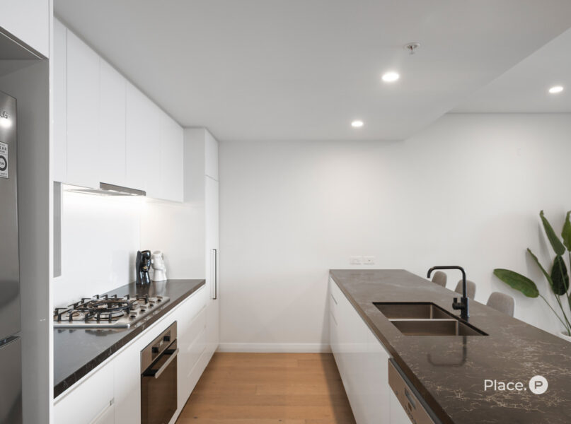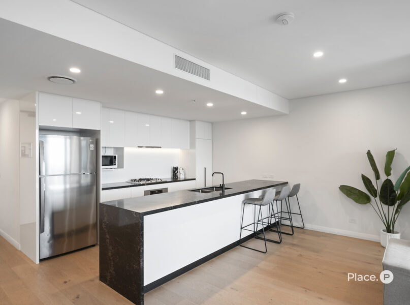 Positioned on the top residential level of Utopia Residences, this two-bedroom apartment sits at the pinnacle of a building designed by Kris Kowalski Architects and delivered by Hutchinson Builders. From this height, the city opens up to the south-east, with sweeping views beyond the Story Bridge and along the curve of the Brisbane River — a backdrop that feels expansive by day and quietly beautiful by night.