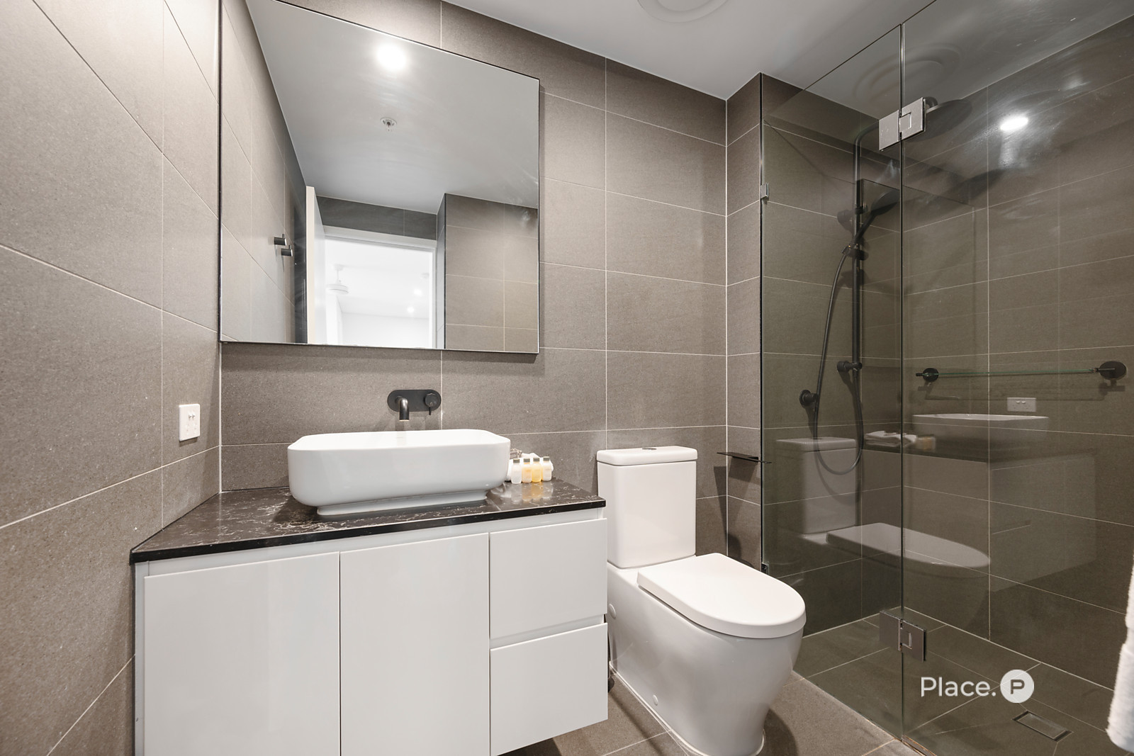 Both bedrooms are designed as calm, private retreats, with built-in storage and expansive glazing that keeps the outlook close without intruding. The master suite is complemented by its own ensuite and walk-in wardrobe, while the second bathroom mirrors the same clean, contemporary detailing. Ducted air conditioning, secure access, and an internal laundry ensure comfort is effortless and uninterrupted.