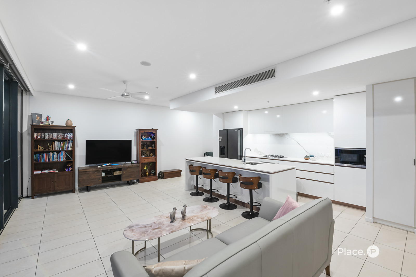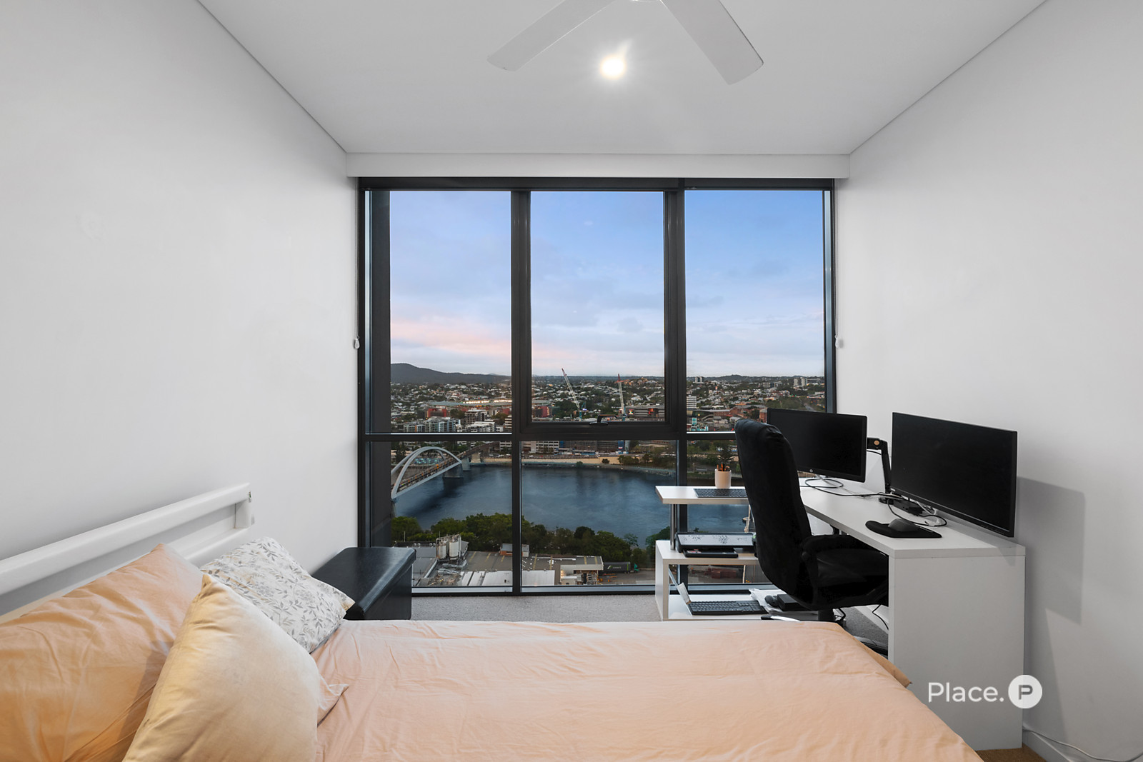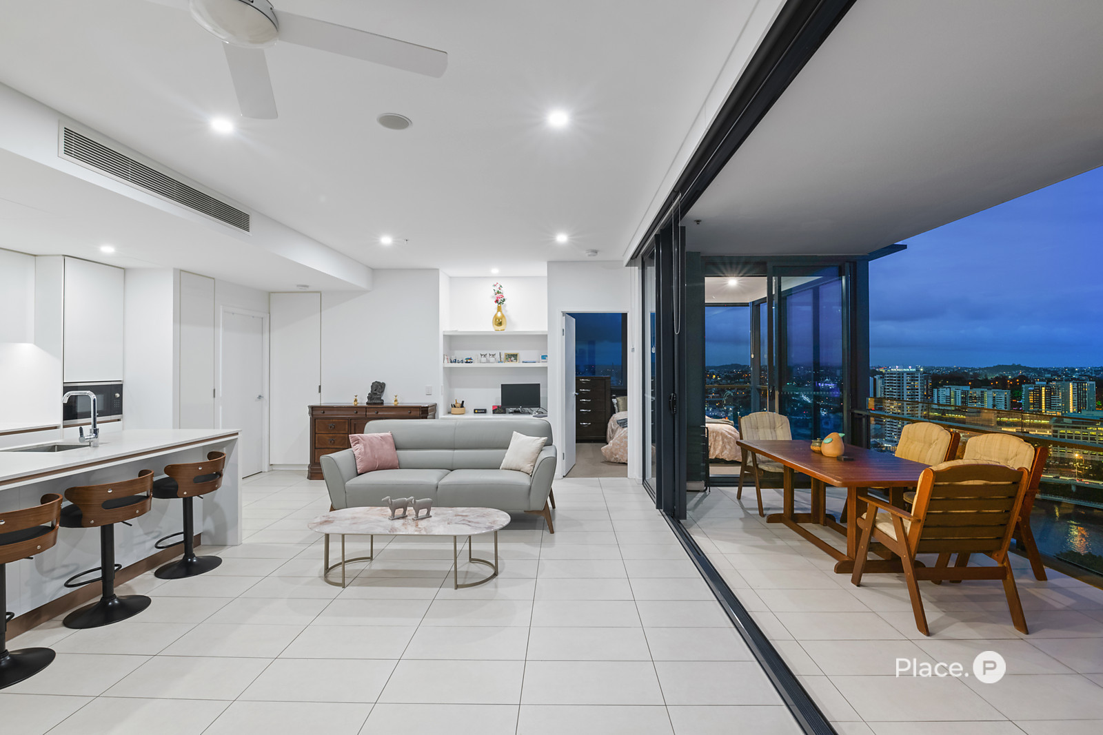 Stepping inside, you are greeted by a spacious open-plan living and dining area which offers uninterrupted views enhanced by the superior privacy of a corner position. Seamlessly linking the central living area to the outdoors, large glass sliding doors reveal a covered balcony with vast amounts of entertainment space. Looking out across the Brisbane River to the iconic city skyline, the glamorous new Queens Wharf precinct and tree-dotted parklands, this enviable al fresco area provides an exceptional vantage point for watching the spectacular fireworks on New Year’s Eve and River Fire events.