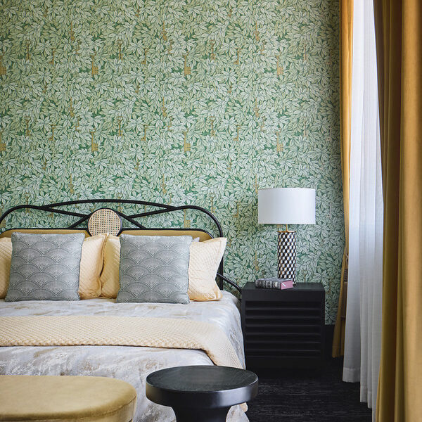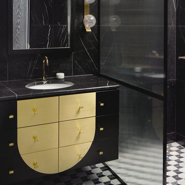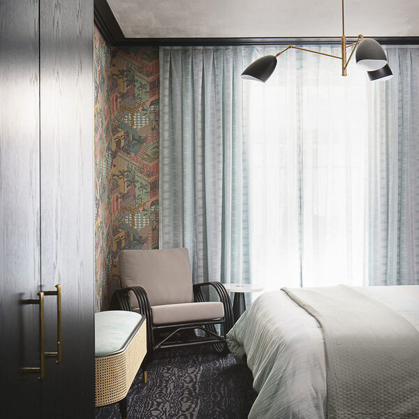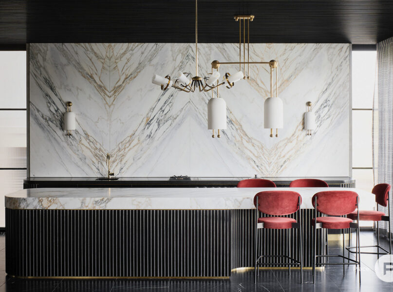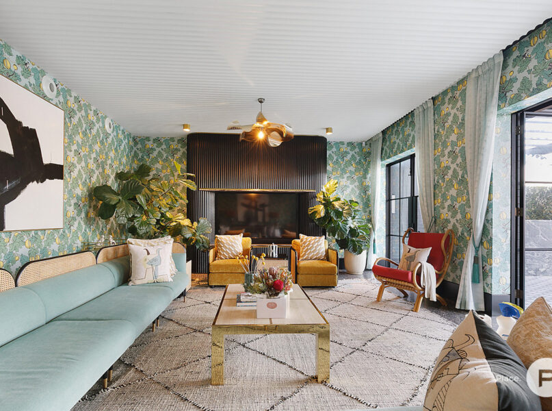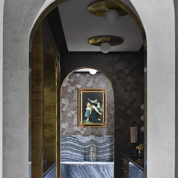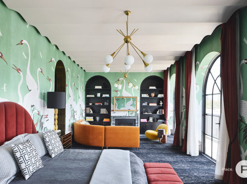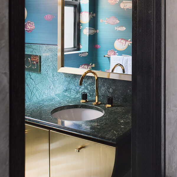 Intelligently crafted, the home’s ground level boasts a spacious open-plan living and dining area. Continuing from the property’s pendant light-adorned entry, this impeccable central area is punctuated by De Gournay wallpaper and a custom paonazetto marble fireplace. There is also an adjoining library and a study, plus an enviable kitchen displaying a breakfast bar, a butler’s pantry, stone details, Gaggenau appliances and ample cupboard storage.