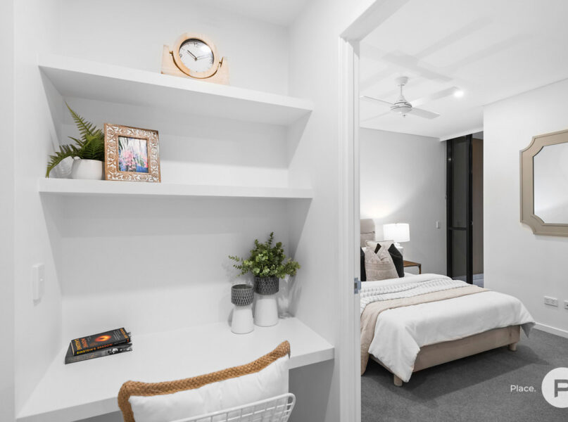 The layout offers two large sized bedroom, with a study nook for working remotely, and there is also two contemporary bathrooms for added comfort. The kitchen is well-equipped with an integrated dishwasher, a gas cooktop and ample prep space with a bench that wraps around into the light-filled living area. A covered balcony is the best place to take in those incredible views as you end the day with a drink in hand.