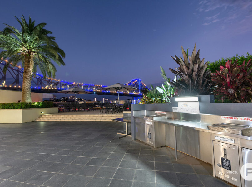 Continuing from the apartment’s entry, a sizeable open-plan living and dining area invites you to relax and host guests in style. Extending from here, a covered balcony looks out across the Brisbane River to the iconic Story Bridge and leafy Captain Burke Park. Gather family and friends for a superb al fresco meal, sunset drinks or an unforgettable celebration.