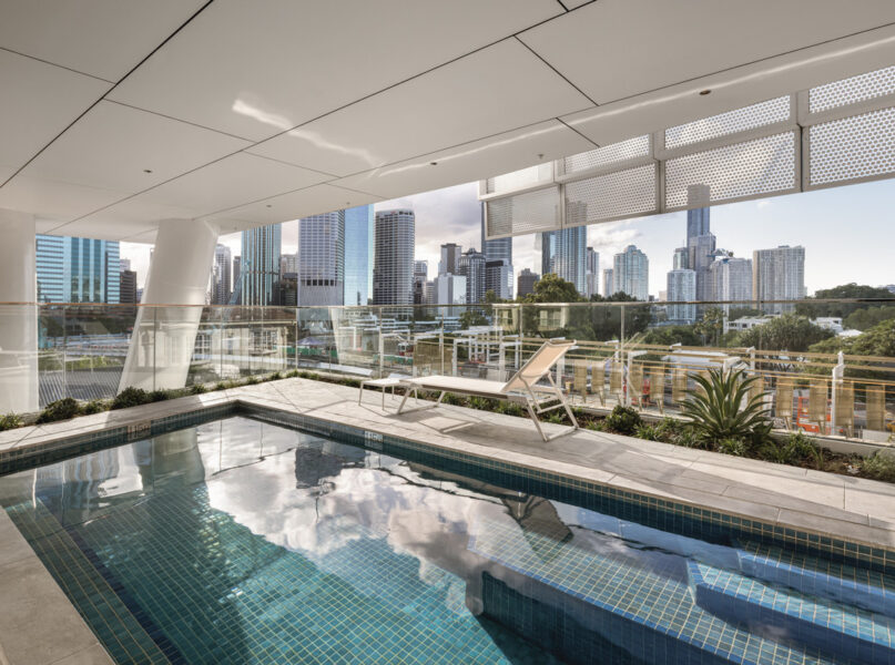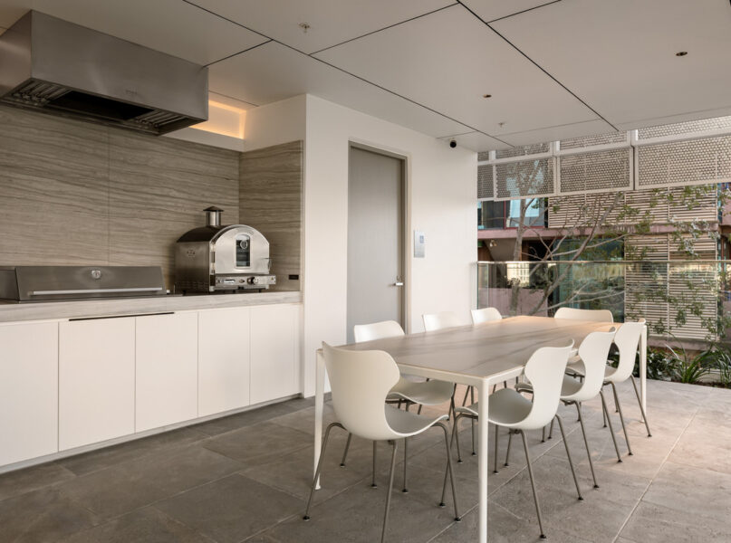 Floating three storeys above street level, overlooking CT White Park and the City, Thornton delivers residents a generous pool and recreation deck. This space includes fully-tiled pool, BBQ and pizza oven, casual lounges and formal dining settings.