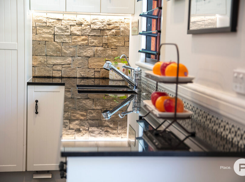 – Renovated adjoining kitchen equipped with stone accents, quality appliances and ample cupboard storage