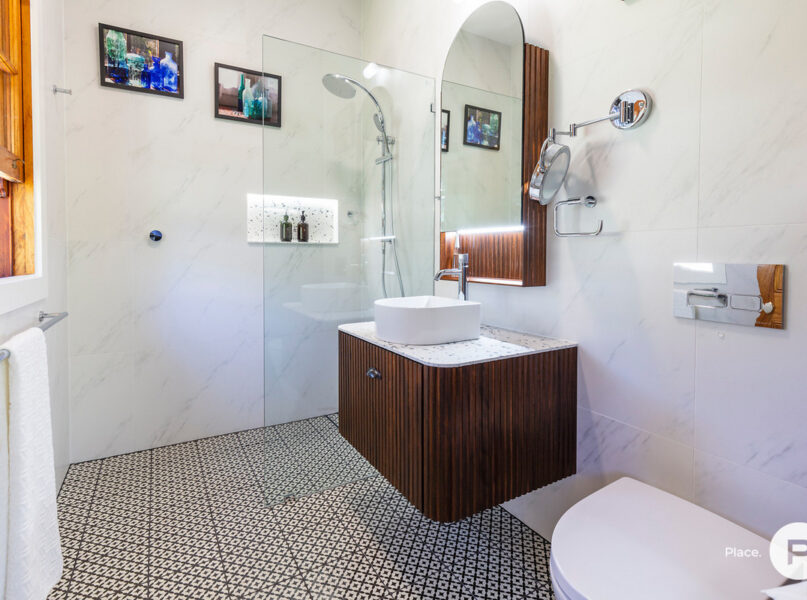 – Updated main bathroom displaying floor-to-ceiling tiling and a large frameless shower