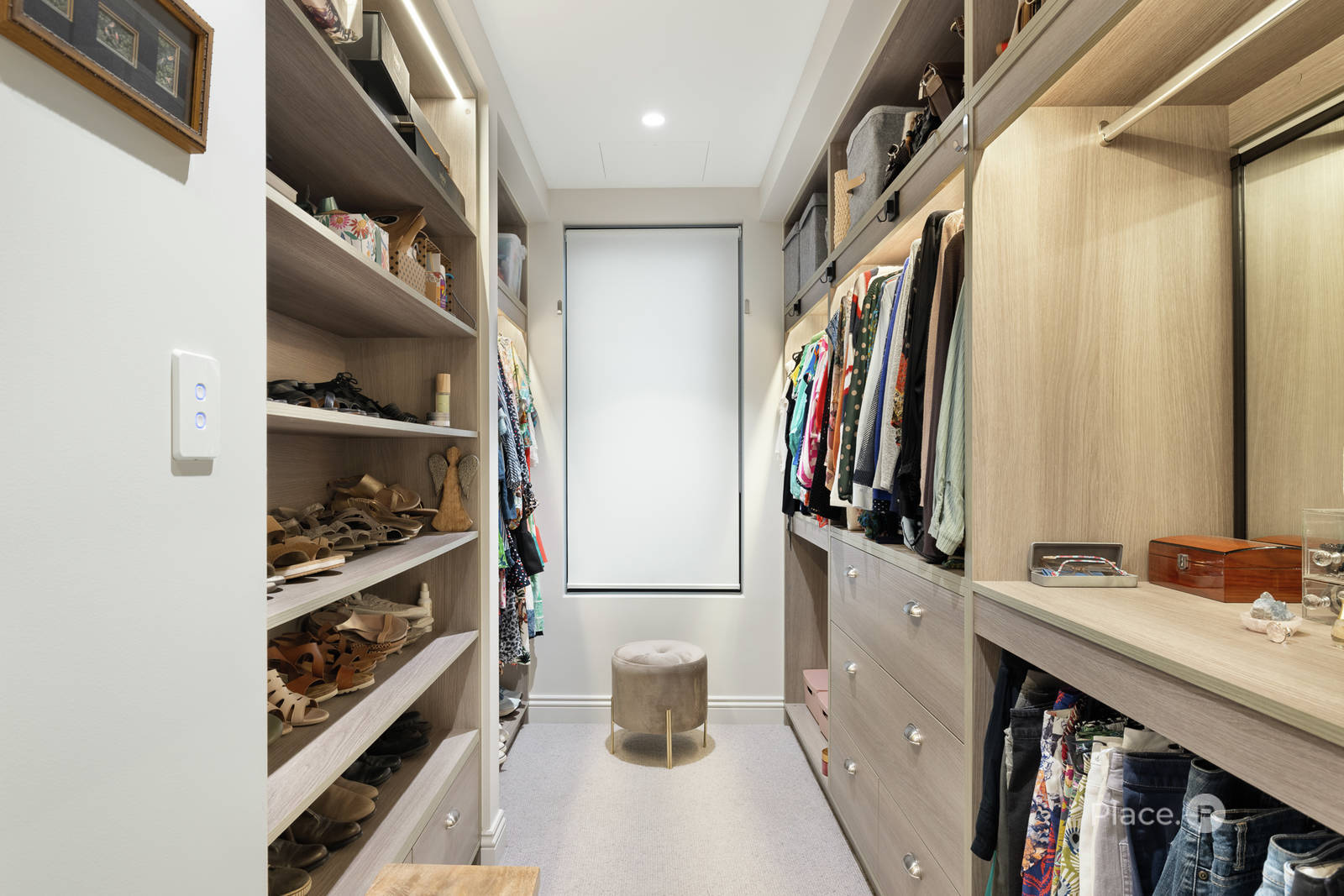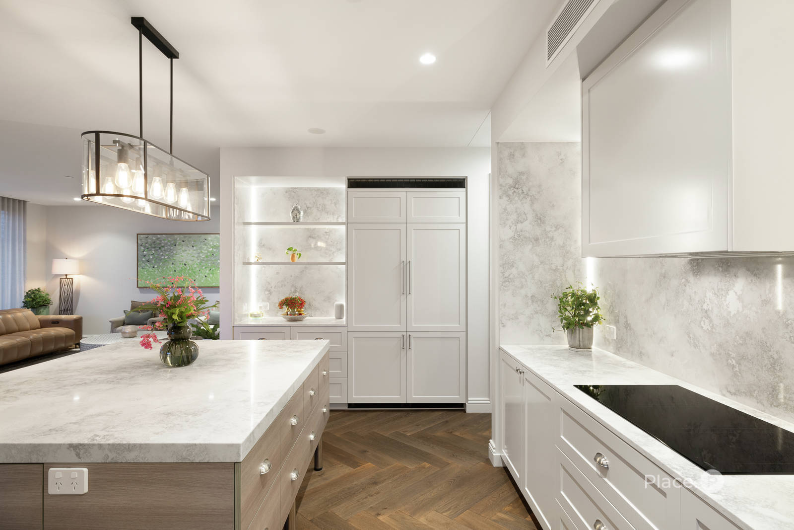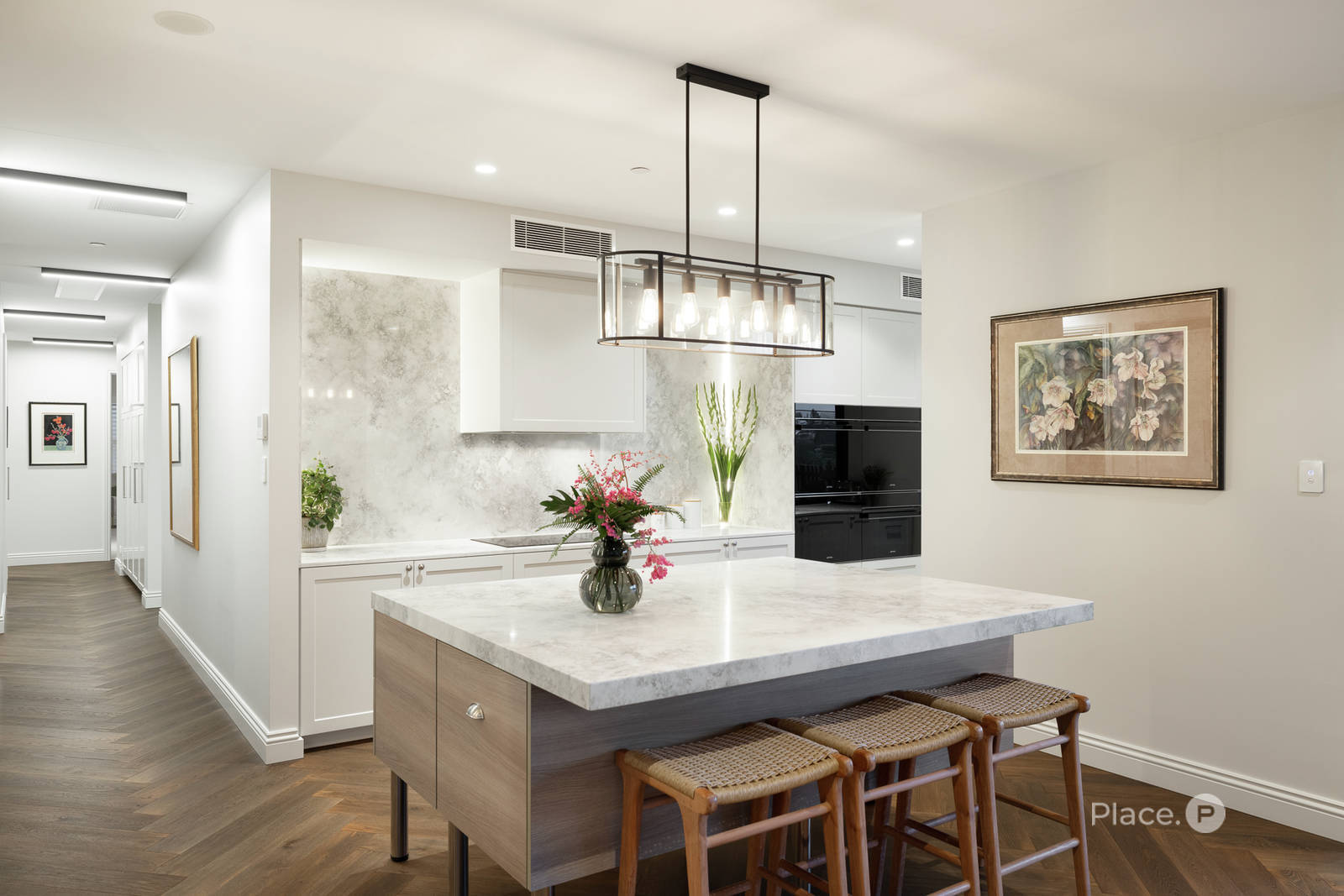 The open-plan design maximizes the stunning vistas and natural breezes, seamlessly blending indoor and outdoor living. Featuring herringbone parquetry floors, custom joinery, wool carpets, and automated blinds, the space exudes refined elegance. The chef’s kitchen boasts a large stone island, integrated Smeg appliances, dual ovens, and a wine fridge, while stacking sliding doors open to an entertainer’s balcony with lush gardens, a marble servery, and spectacular views, including Riverfire.