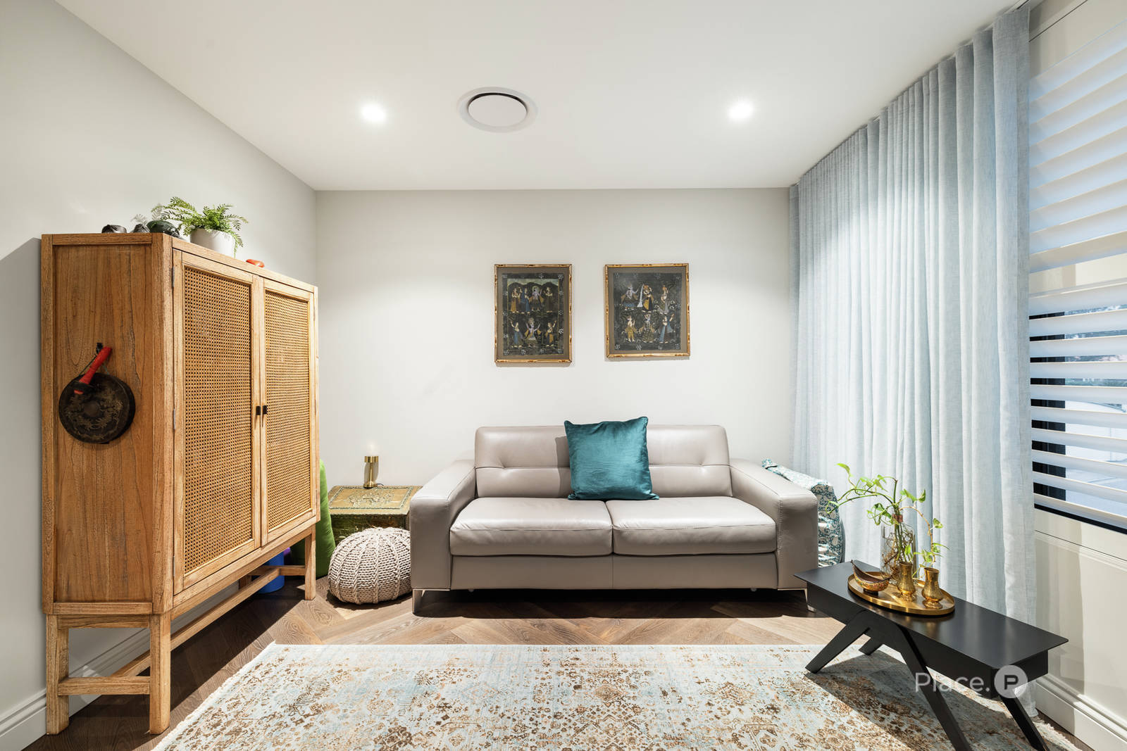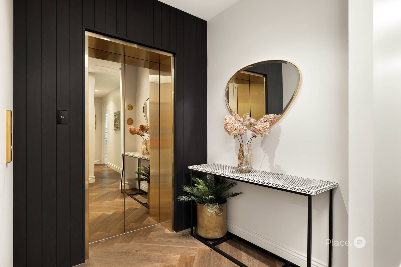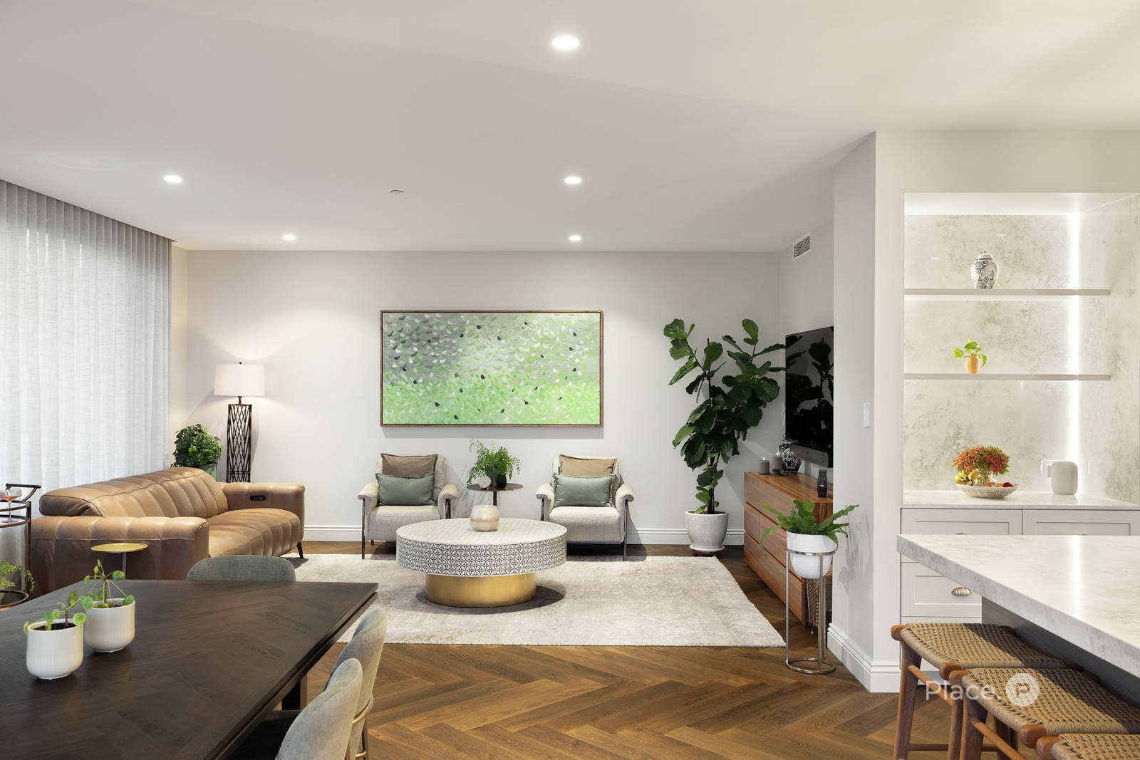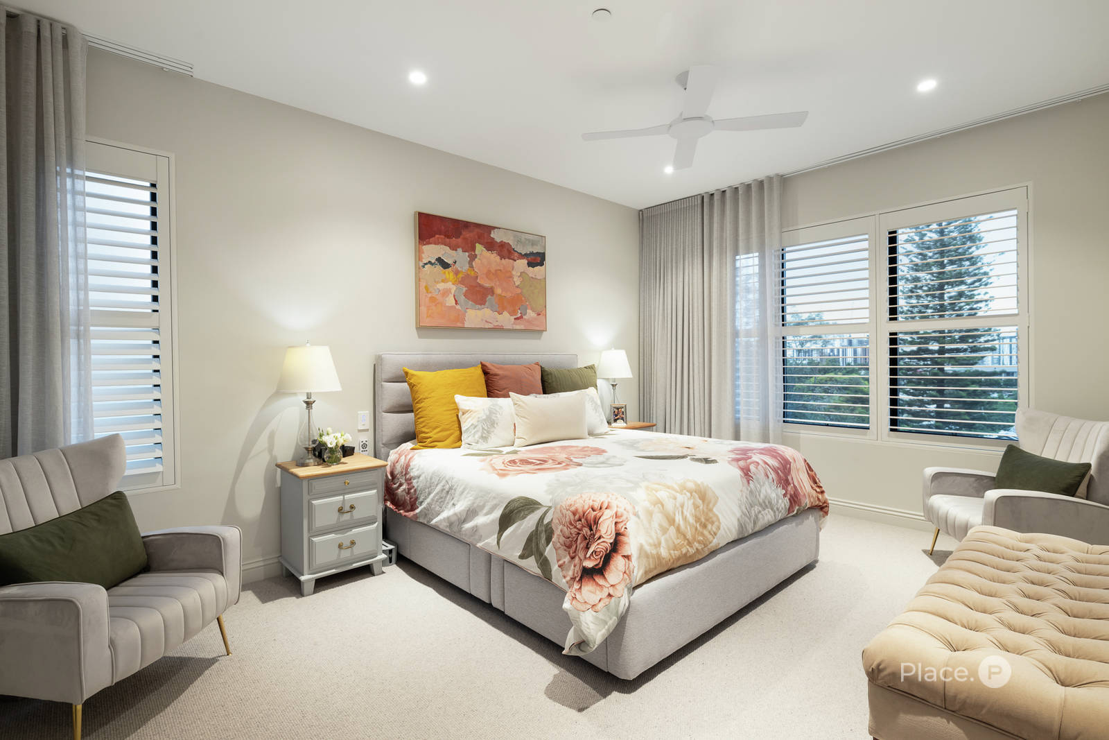 The open-plan design maximizes the stunning vistas and natural breezes, seamlessly blending indoor and outdoor living. Featuring herringbone parquetry floors, custom joinery, wool carpets, and automated blinds, the space exudes refined elegance. The chef’s kitchen boasts a large stone island, integrated Smeg appliances, dual ovens, and a wine fridge, while stacking sliding doors open to an entertainer’s balcony with lush gardens, a marble servery, and spectacular views, including Riverfire.