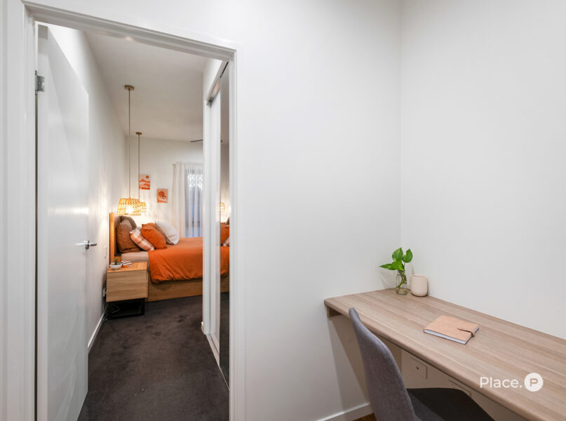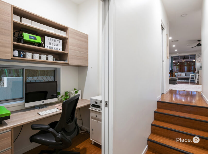 • Workspaces: An enclosed study space downstairs with built-in desk and shelving and a study nook upstairs alongside the Master Suite.