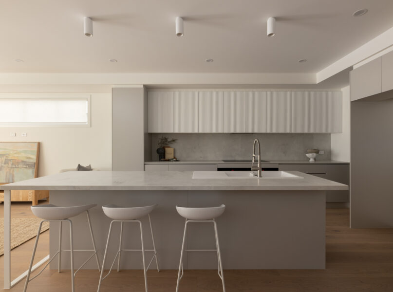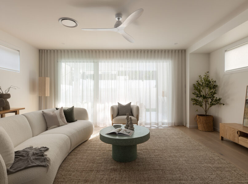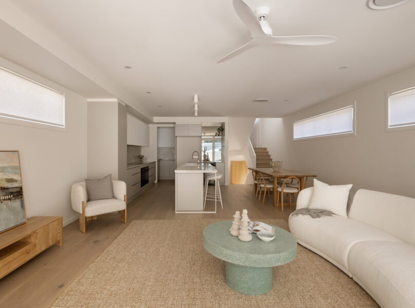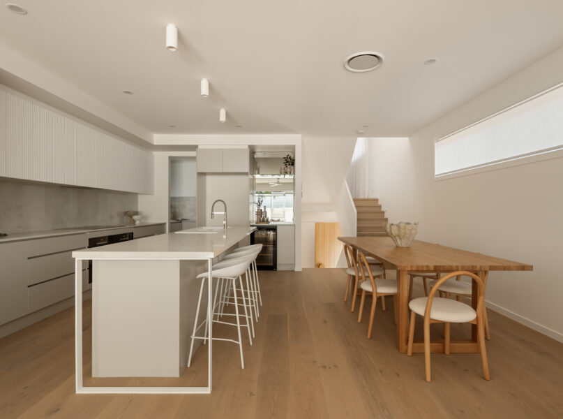 Beautifully modern, the home is given incredible street appeal by its striking contemporary facade and landscaped front gardens. Continuing the refinement inside are details such as engineered timber floors, lofty ceilings and a calming neutral colour palette.