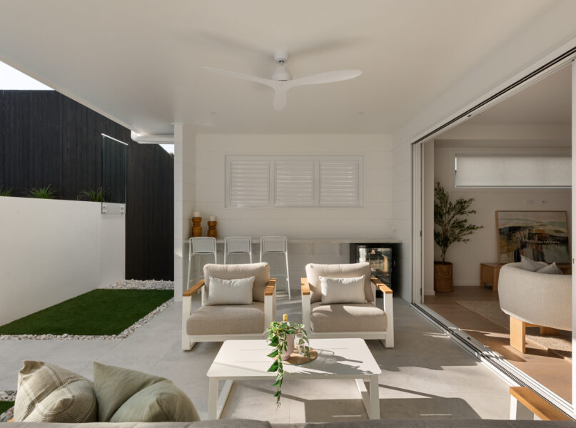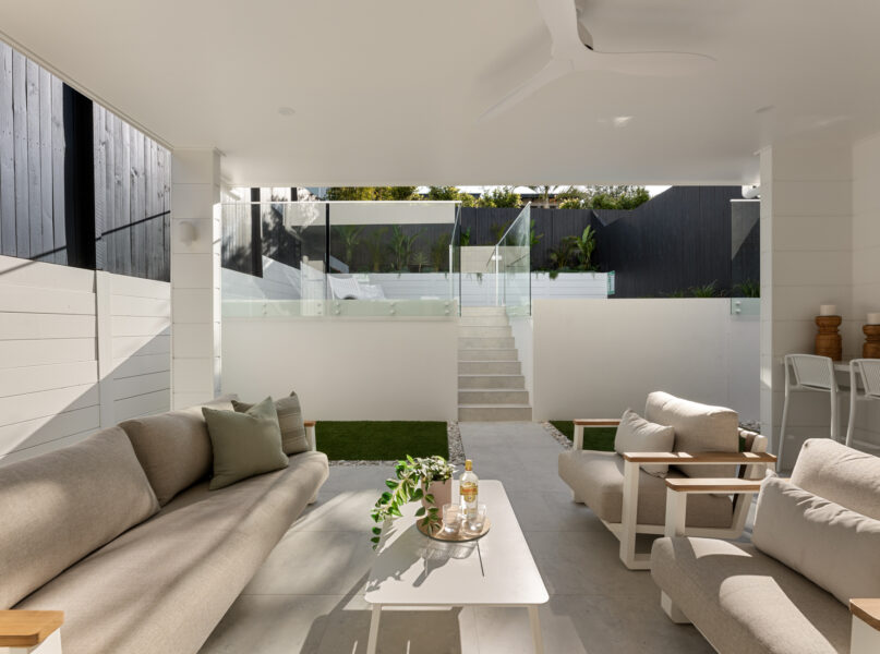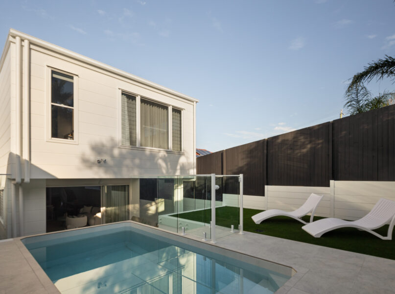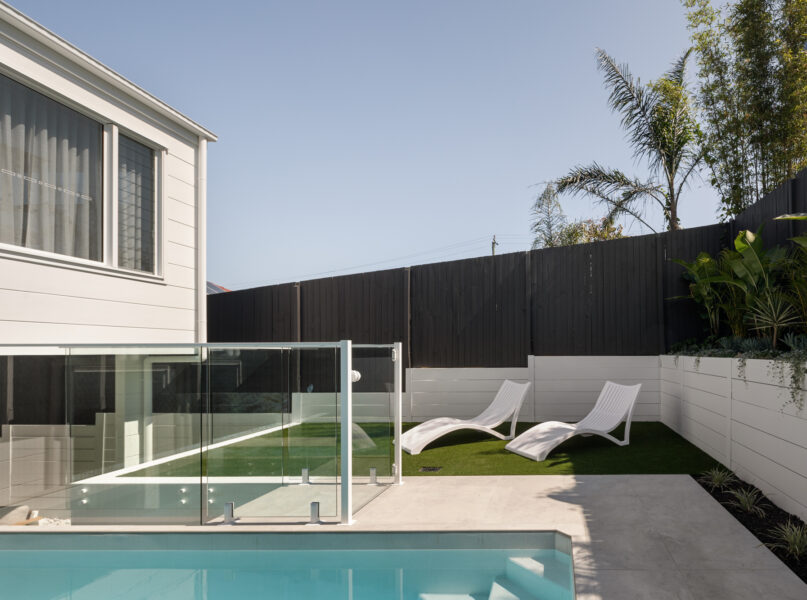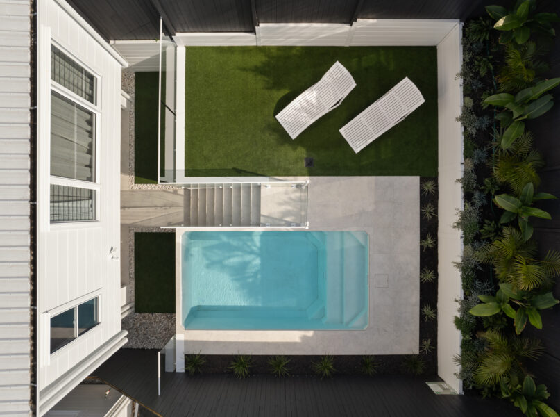 Outside, a covered al fresco area has built-in bench seating. Relax and host guests here, or ascend to the elevated terrace area to cool off in the Plungie in-ground swimming pool or unwind in the fully-fenced artificially-turfed area.