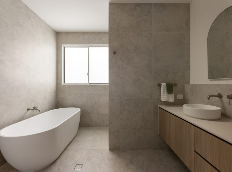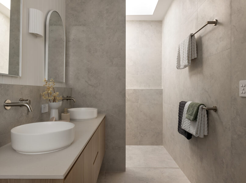 Looking out over the rear yard, a lavish master suite has a walk-in robe. An attached ensuite features floor-to-ceiling tiling and dual vanities.