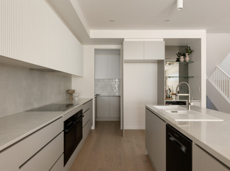 Capturing excellent natural light, a spacious open-plan living and dining area is situated on the property’s ground level. Encompassing a wet bar with a Vintec wine fridge, this welcoming central space adjoins an exceptional kitchen displaying a breakfast bar, quality appliances, a butler’s pantry and ample cupboard storage.