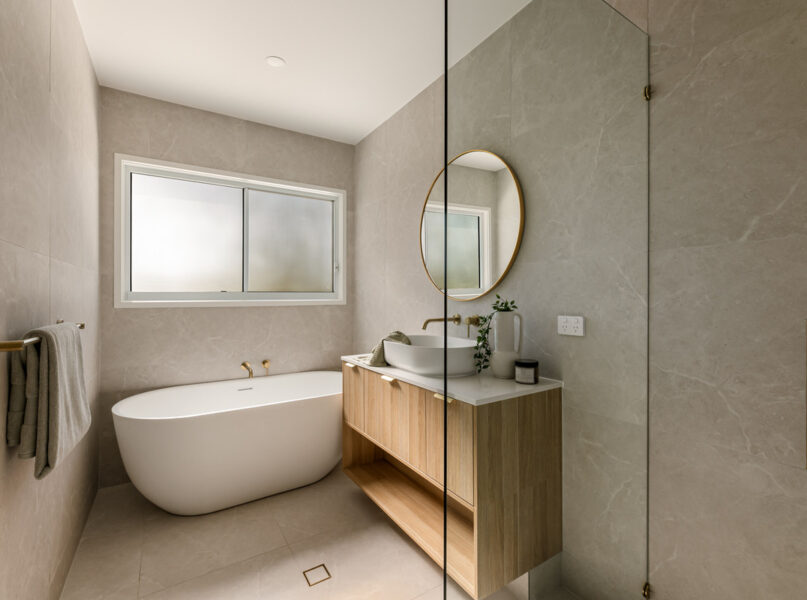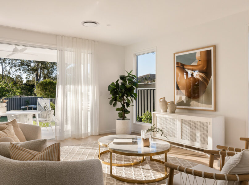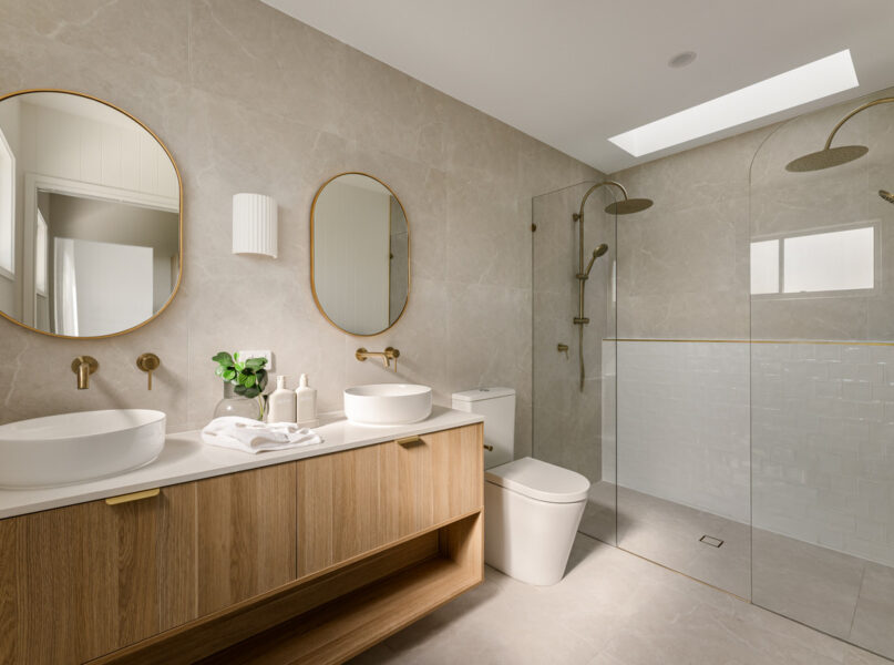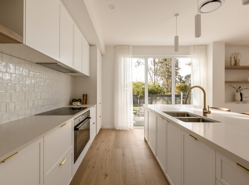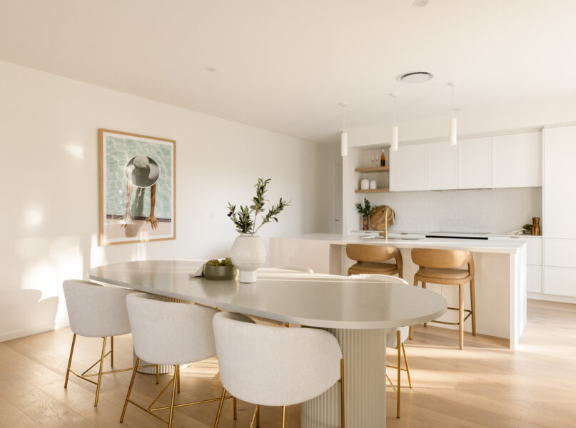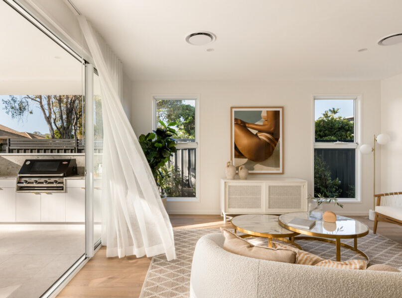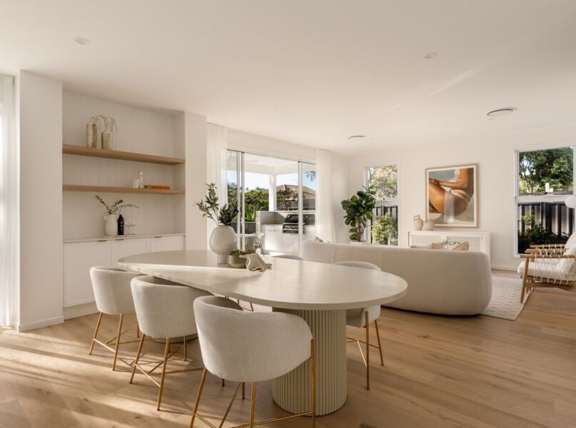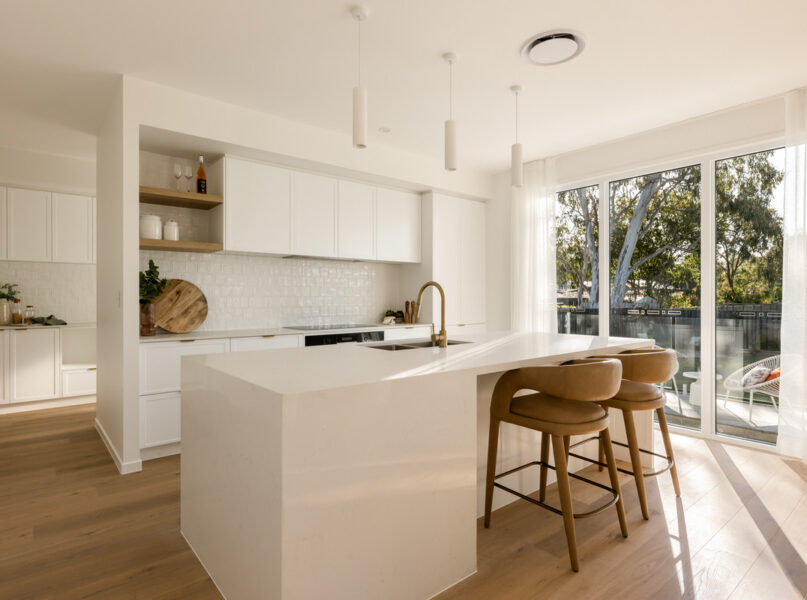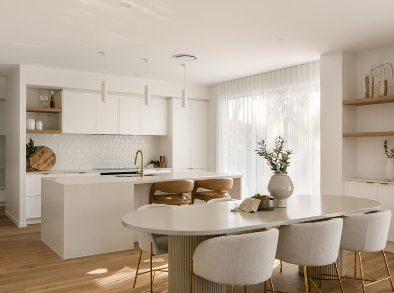 Ideal for relaxing and hosting guests in style, a spacious open-plan living and dining area seamlessly flows from the home’s ground-level entry. Featuring lofty 2.7-metre-high ceilings, this welcoming central space adjoins a spectacular kitchen displaying a full suite of Bosch appliances, Carrara stone benchtops, brass tapware, a large breakfast bar, a butler’s pantry and ample cupboard storage.