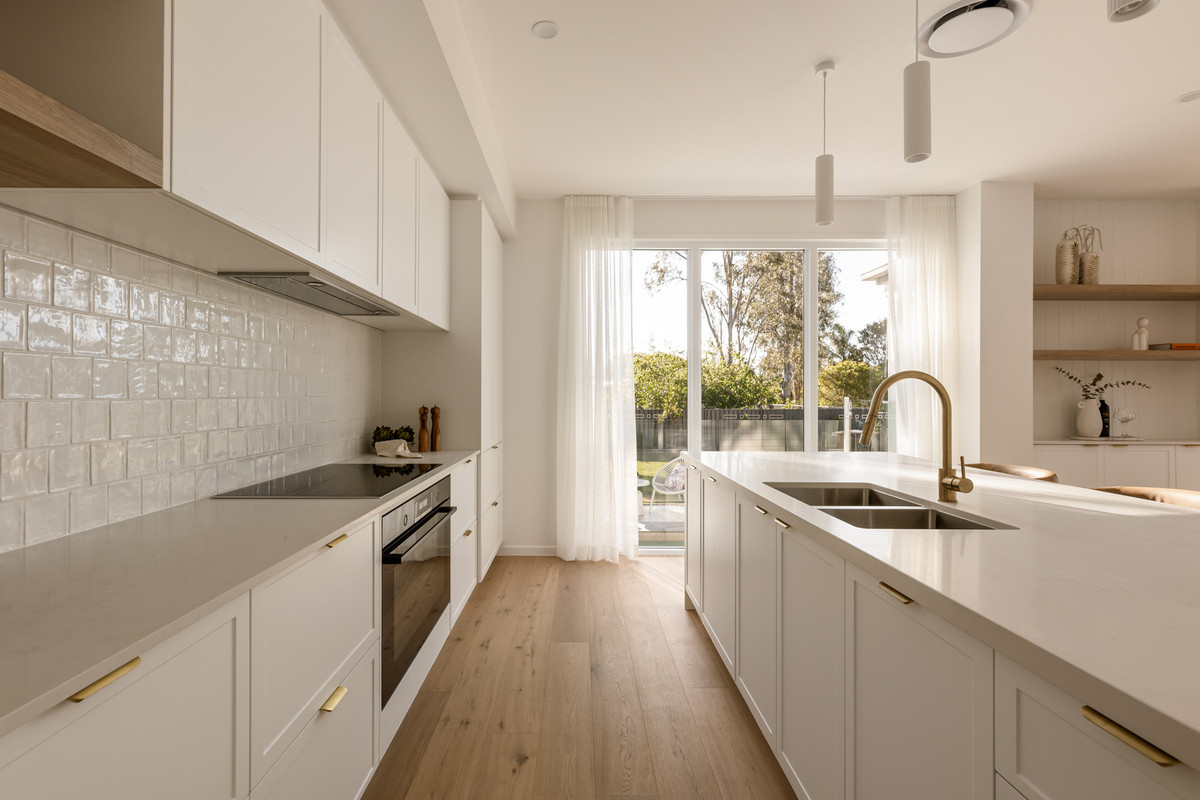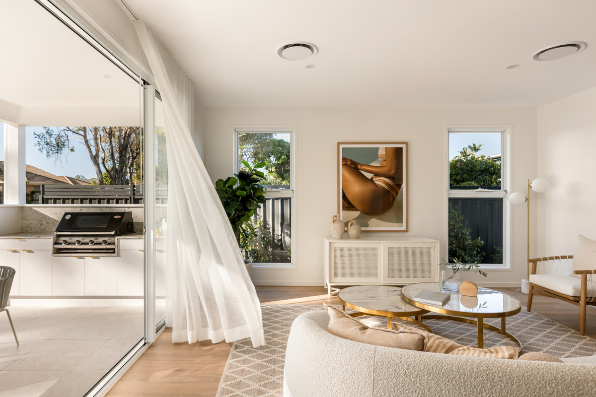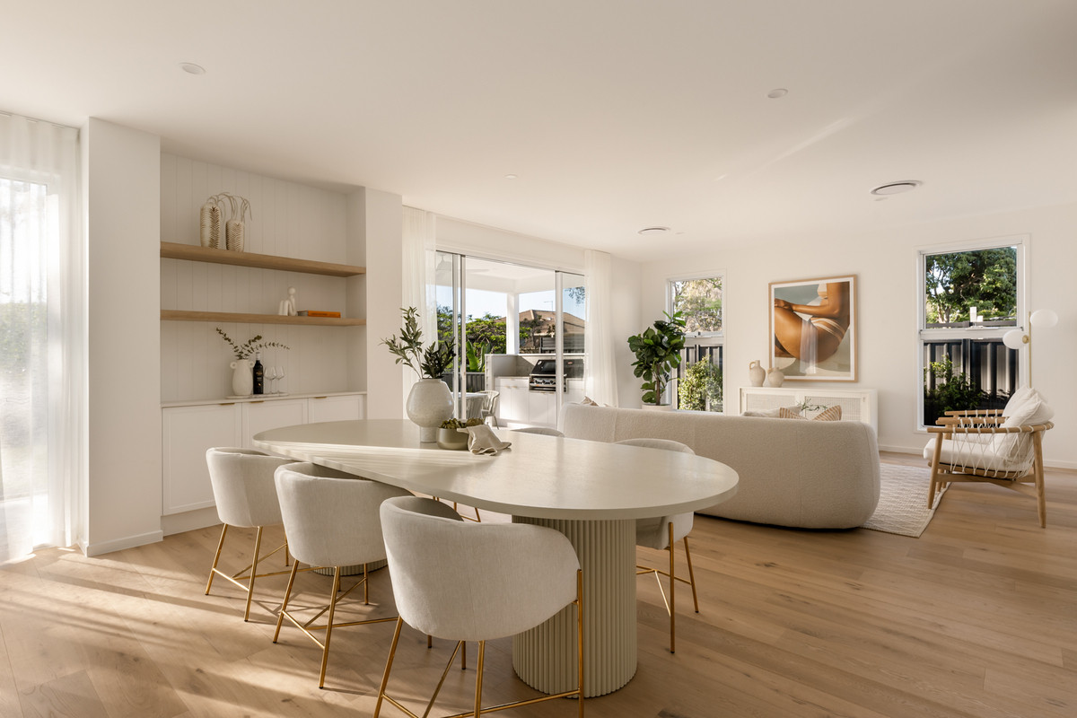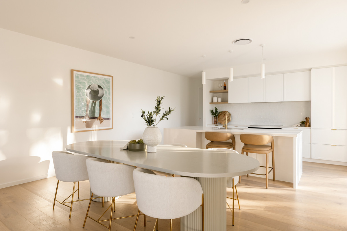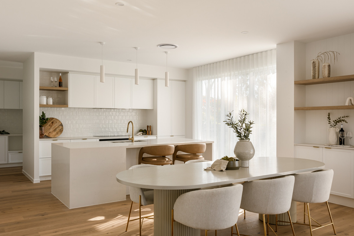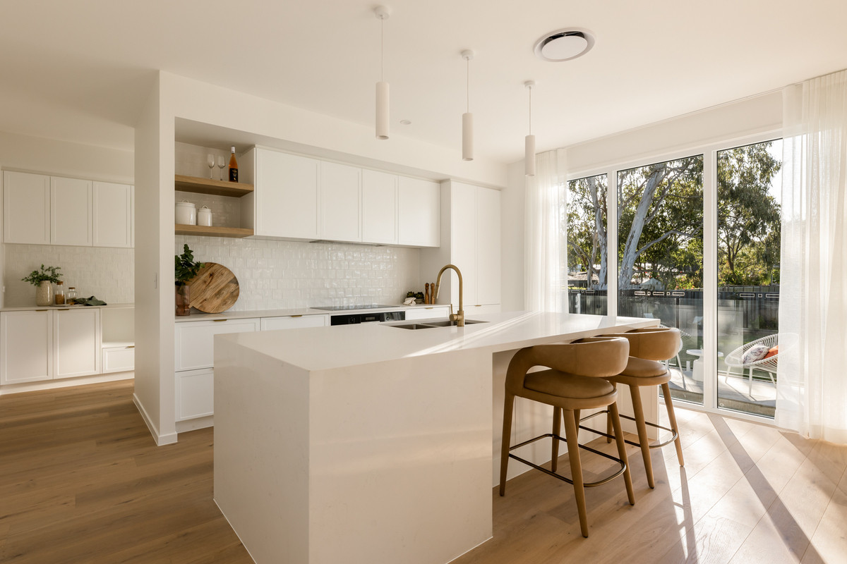 Ideal for relaxing and hosting guests in style, a spacious open-plan living and dining area seamlessly flows from the home’s ground-level entry. Featuring lofty 2.7-metre-high ceilings, this welcoming central space adjoins a spectacular kitchen displaying a full suite of Bosch appliances, Carrara stone benchtops, brass tapware, a large breakfast bar, a butler’s pantry and ample cupboard storage.