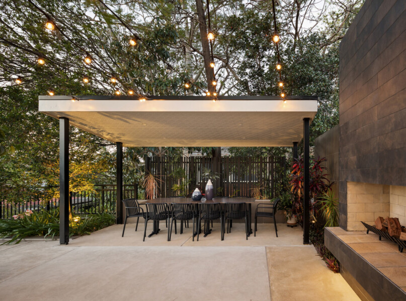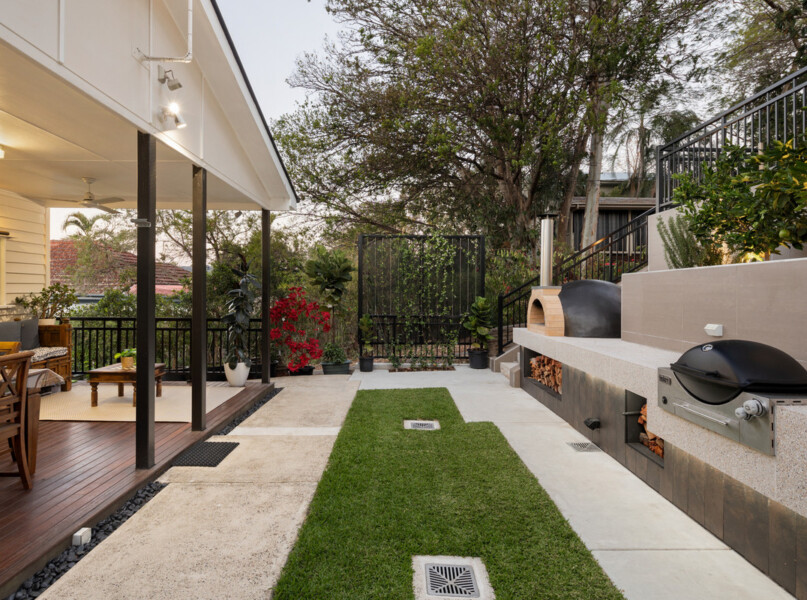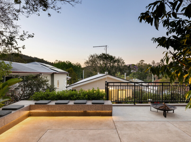 Elevate your gatherings with family and friends with the impressive outdoor kitchen, complete with a built-in barbecue and a pizza oven. An upper terrace showcases integrated bench seating, a fireplace, a spacious pergola and picturesque Bardon views. Here, you’ll also find an excellent bar space complemented by a unique splashback featuring images of Bardon’s heritage trams.