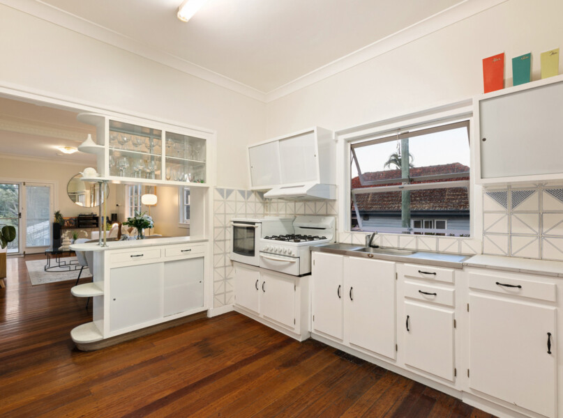 Continuing from the property’s front porch and welcoming entry, the generous open-plan living and dining area is bathed in natural light. The adjoining character-filled kitchen, with its tiled splashback and ample storage, blends functionality with classic aesthetics.