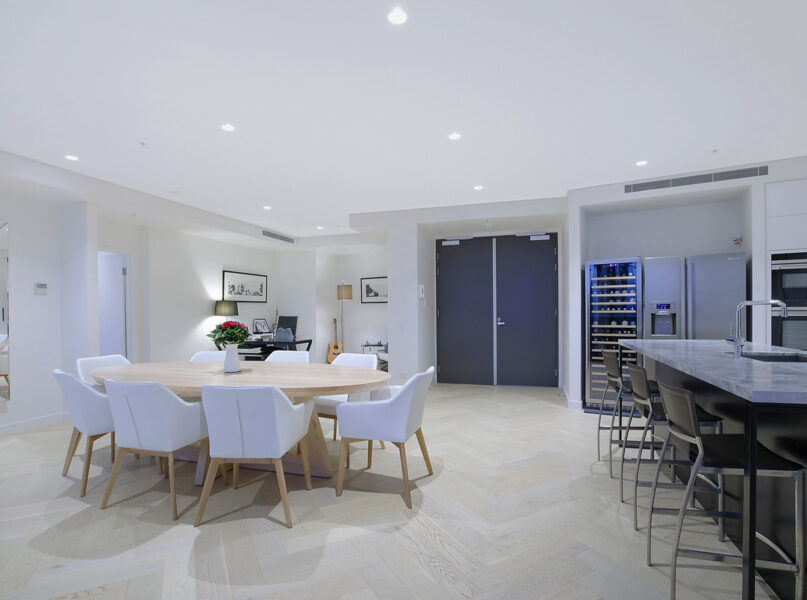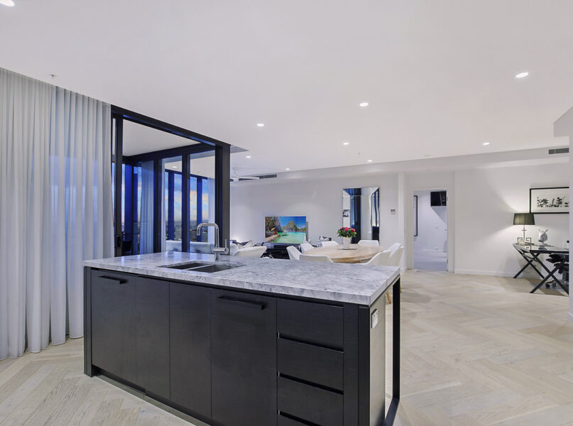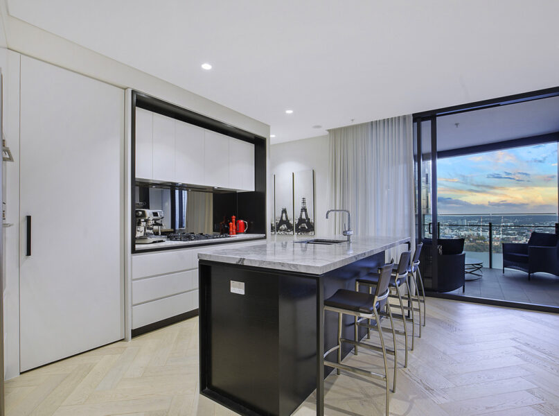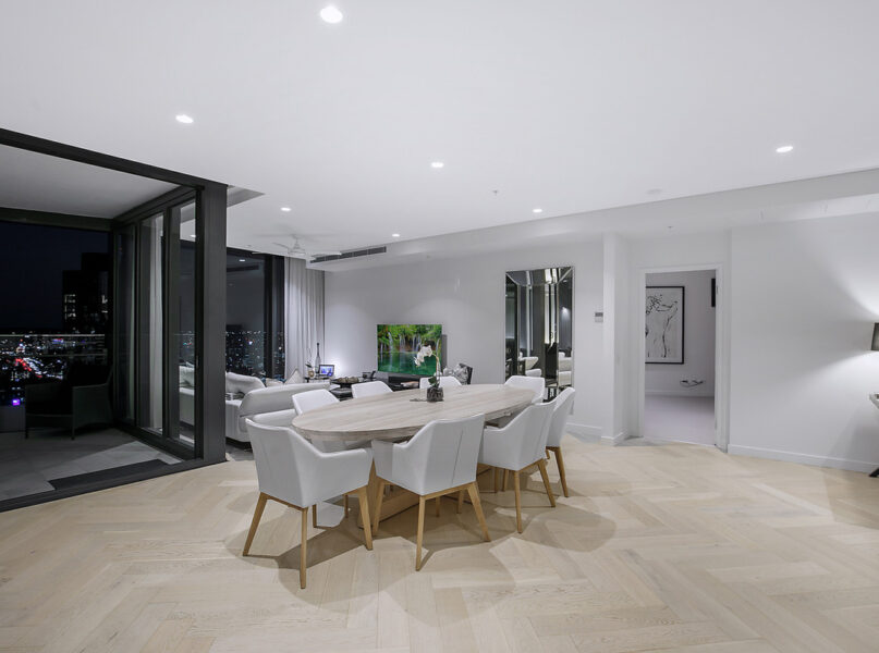 Beautifully designed to complement its cosmopolitan setting, the residence is presented with elegant herringbone timber floors and a sophisticated neutral colour palette. Banks of full-height glass reveal breathtaking city, river, Brisbane City Botanic Gardens, Kangaroo Point Cliffs views and beyond.