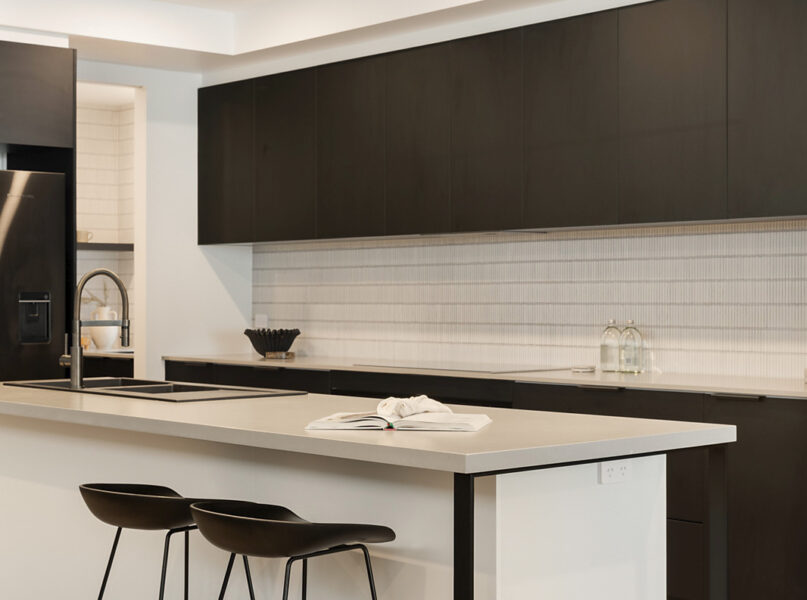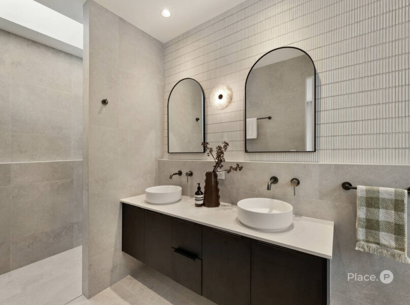 Upstairs, a generous second living area can double as a rumpus room, study or children’s play area. A lavish master bedroom has a large walk-through robe, plus an opulent ensuite with dual vanities, floor-to-ceiling tiling and a skylight-illuminated frameless shower.