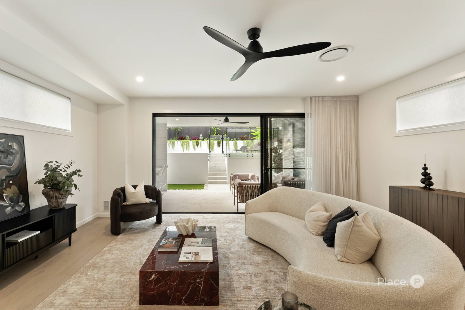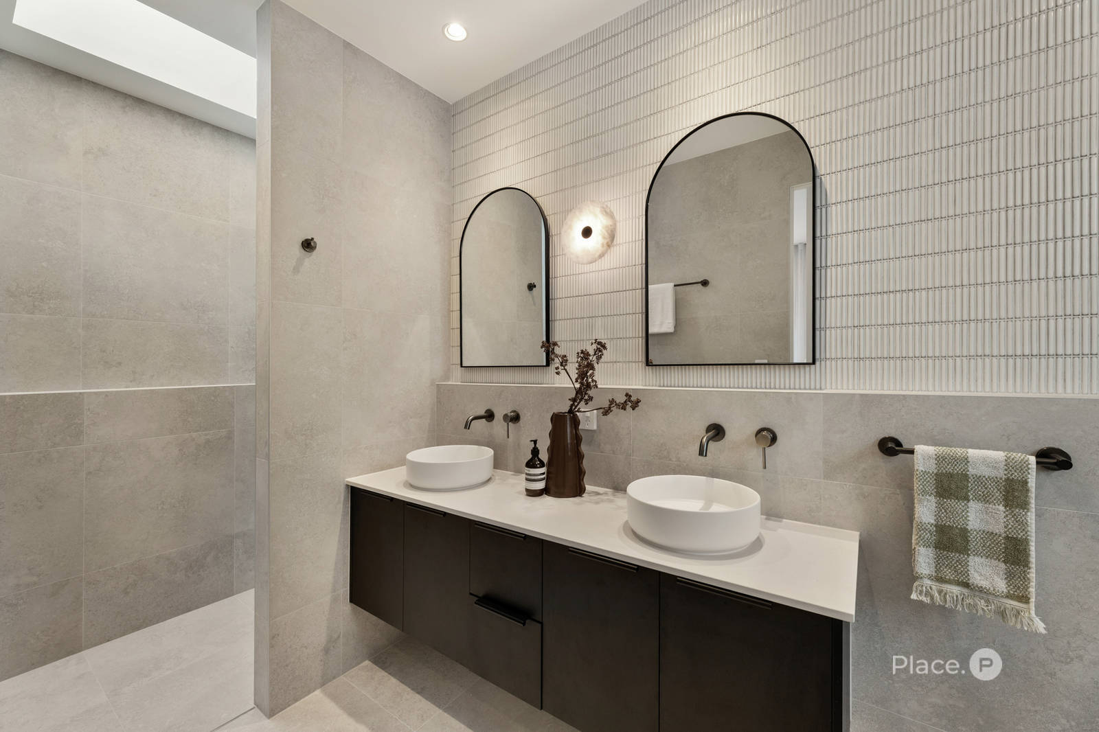 Upstairs, a generous second living area can double as a rumpus room, study or children’s play area. A lavish master bedroom has a large walk-through robe, plus an opulent ensuite with dual vanities, floor-to-ceiling tiling and a skylight-illuminated frameless shower.