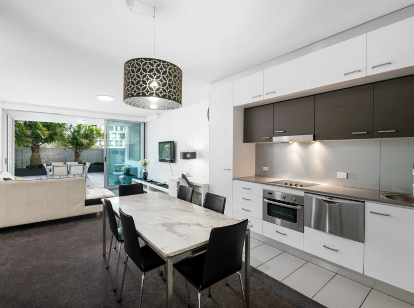 Complementing this functional central area, a modern kitchen features quality appliances including an upgraded oven, a glass splashback and further built-in cupboard storage.