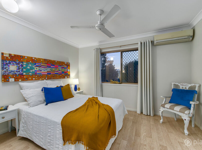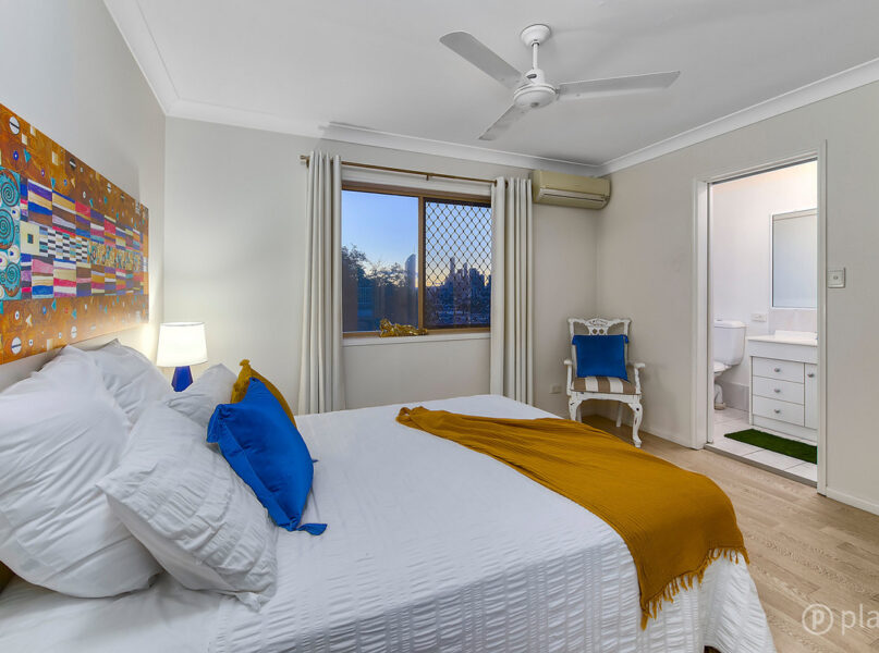 Occupying the third level the master bedroom offers views of the city skyline, with built in robes and connecting ensuite, finished with easy care flooring; a light-filled space for relaxation. The main bathroom services the second bedroom with ease, fitted with fans, split system air con and robe space your visitors are sure to feel at home. Shutters and security screens on the lower and mid level provide privacy and peace of mind for the security conscious owner.