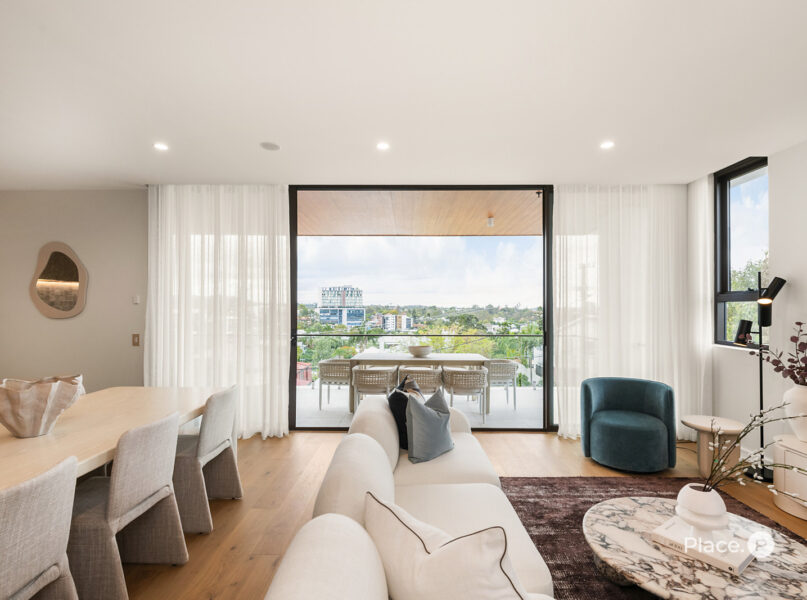 At the heart of the home, a generous open-plan living and dining area welcomes abundant natural light and opens onto a covered balcony — the perfect space for entertaining while taking in the breathtaking city skyline.