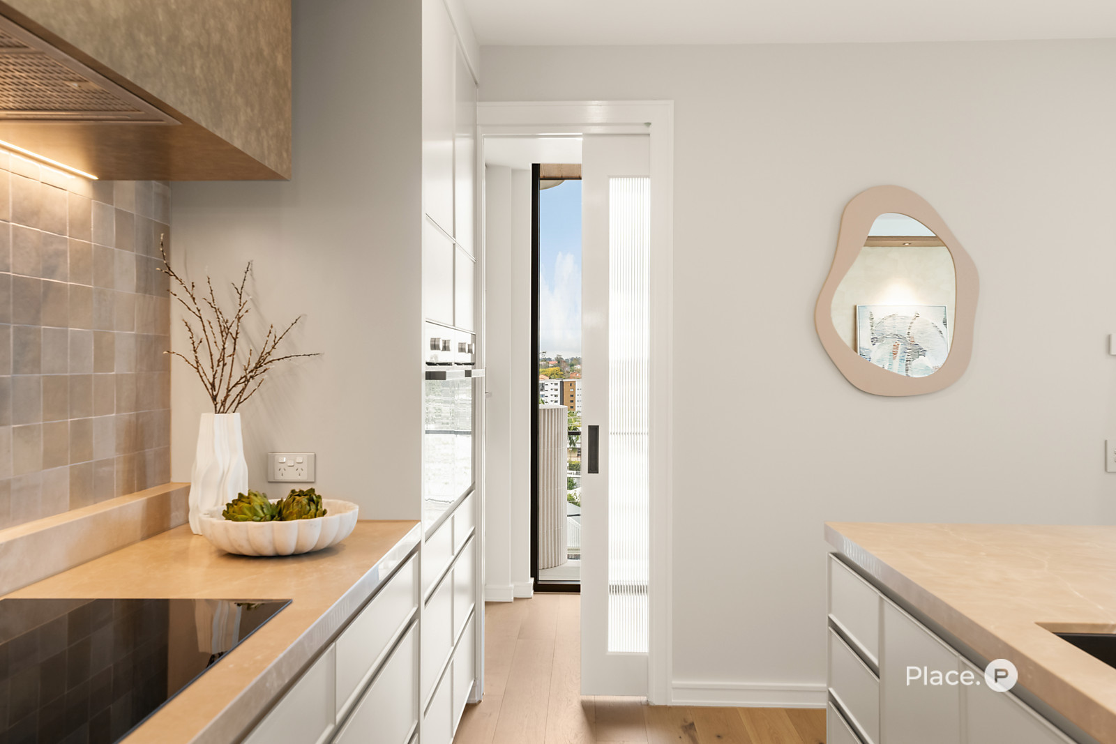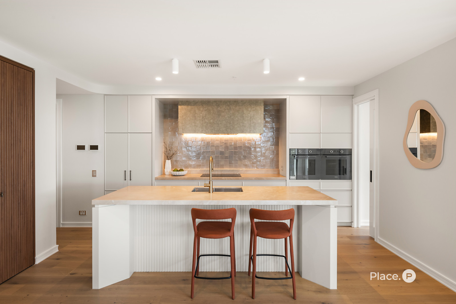 The gourmet kitchen is a showpiece of form and function, featuring a breakfast bar, stone benchtops, and a suite of Miele appliances including dual ovens, a 900mm induction cooktop, and a dishwasher. The adjoining butler’s pantry adds further sophistication with a Miele microwave, integrated wine fridge, and additional storage and prep space.