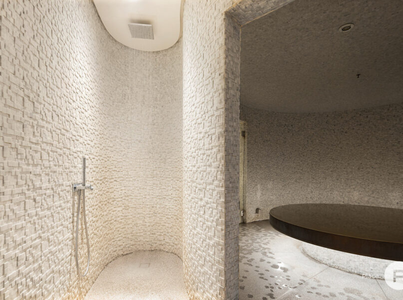 With a practical floor-plan of generous proportions, the residence enjoys two separate wings, including an open-plan living dining and entertaining wing and a bedroom wing. The floors throughout the sub-penthouse are finished with laser-cut travertine, creating a timeless elegance and a fusion between the greenery of the gardens and stone and marble throughout.