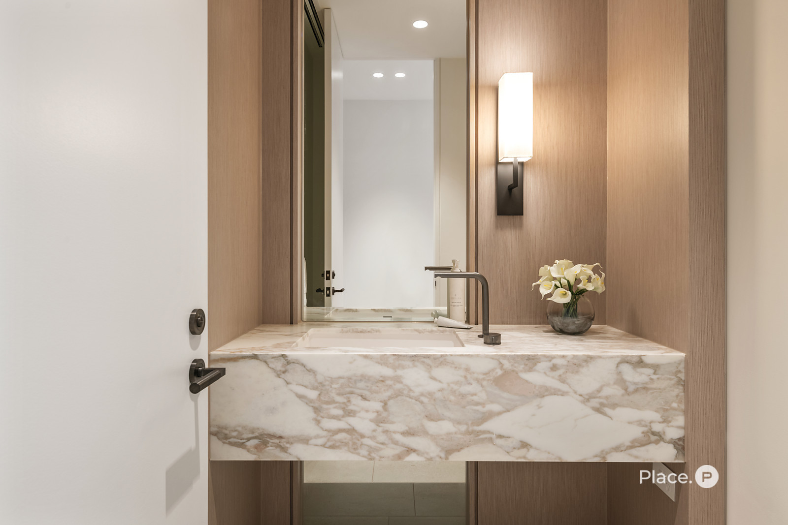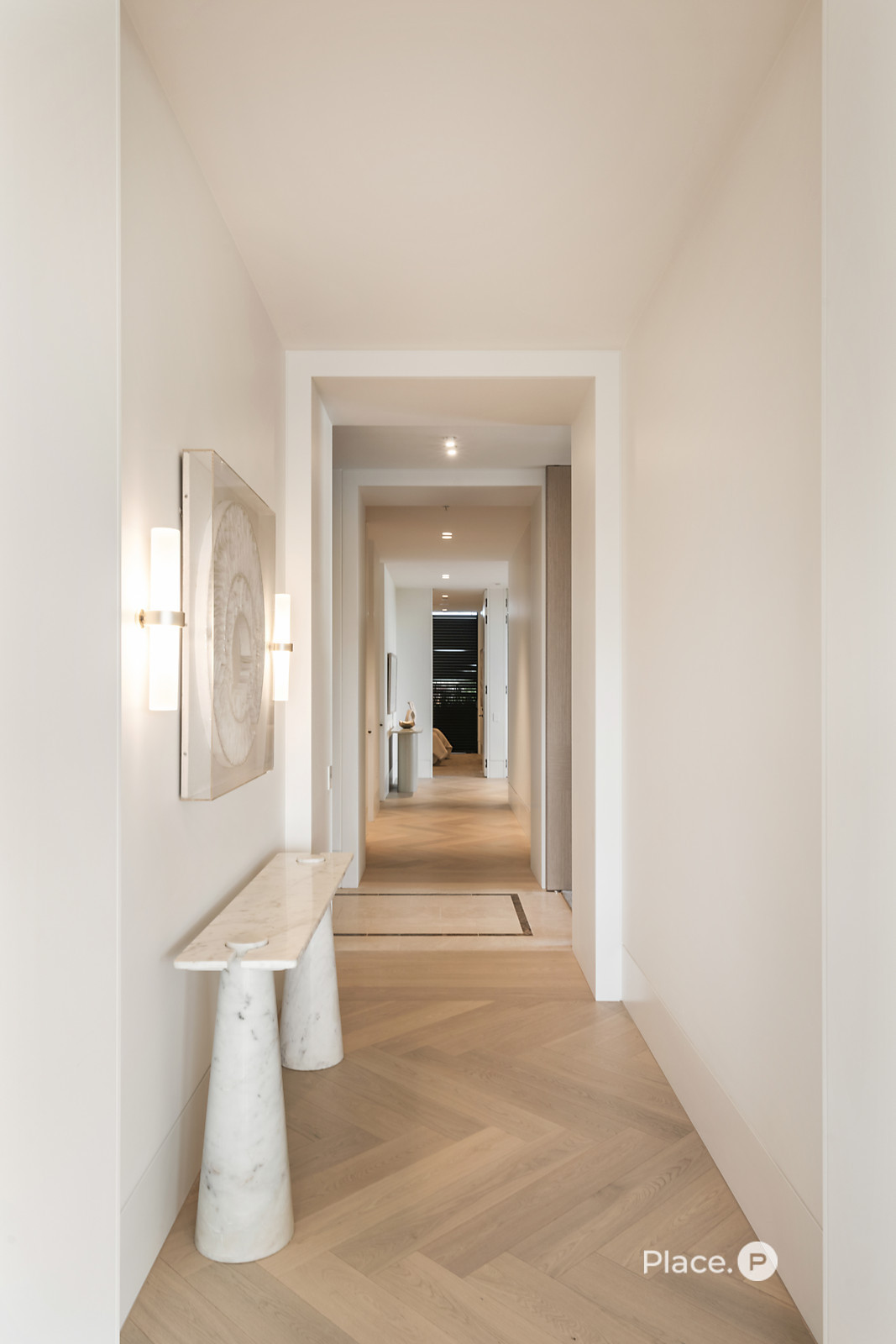 The efficiency of design allows for functional spaces with the hallway offering lengths of dedicated art walls and concealing the guest powder room.