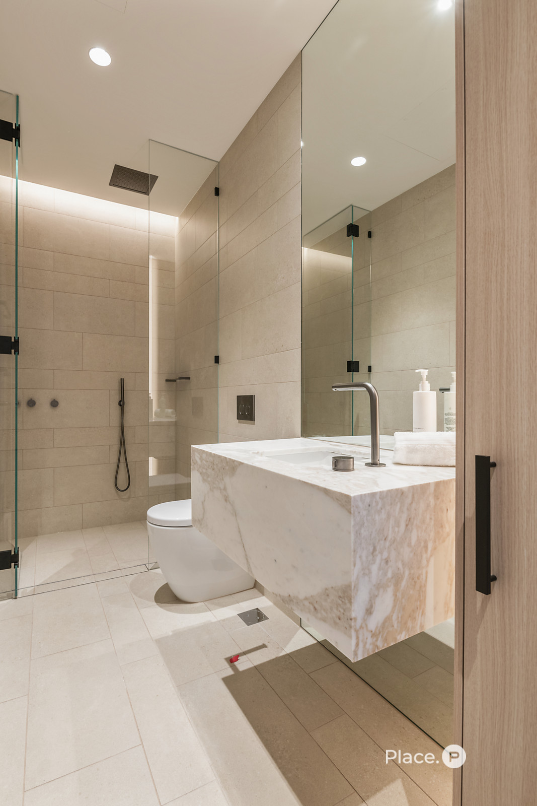The emotive master suite is perfectly hidden away in its own private wing. Upon entry, a lavish wardrobe affording meters of hanging and storage space to accommodate any type of garment with dedicated accessories. Flowing across to the master ensuite characterised by contemporary hardware and soothing, warm toned finishes to inspire rest and tranquillity. The double vanities complimented by concealed storage makes for a functional yet luxurious aesthetic. The freestanding designer bathtub is centered as a feature hiding the oversized shower and toilet behind.