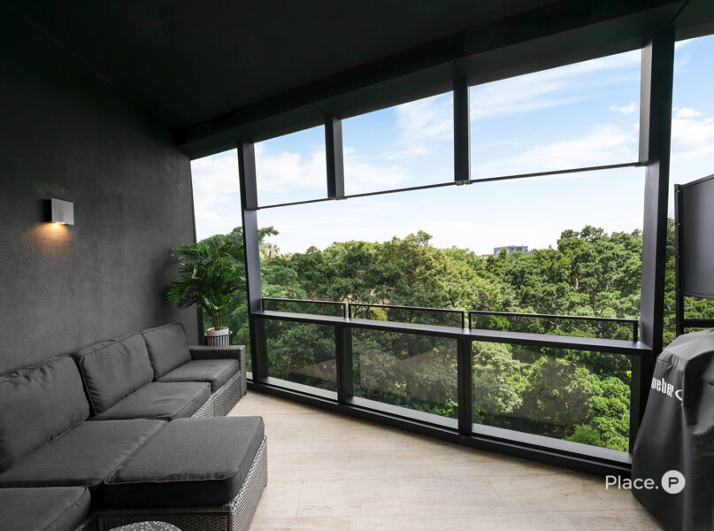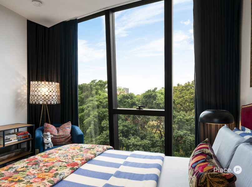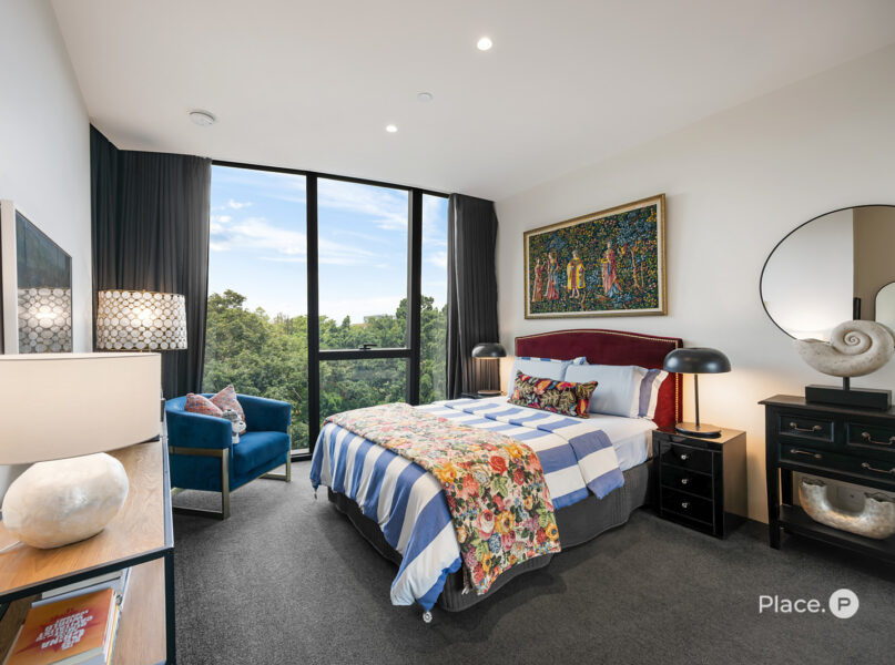 Bathed in natural light, the apartment enjoys lush, uninterrupted views across the Brisbane Botanic Gardens, framed by soaring floor-to-ceiling glass in both the living area and bedroom. The outlook creates a tranquil, leafy atmosphere that feels private and serene, while still being positioned in the heart of the city.