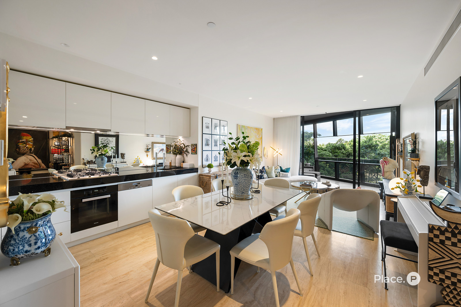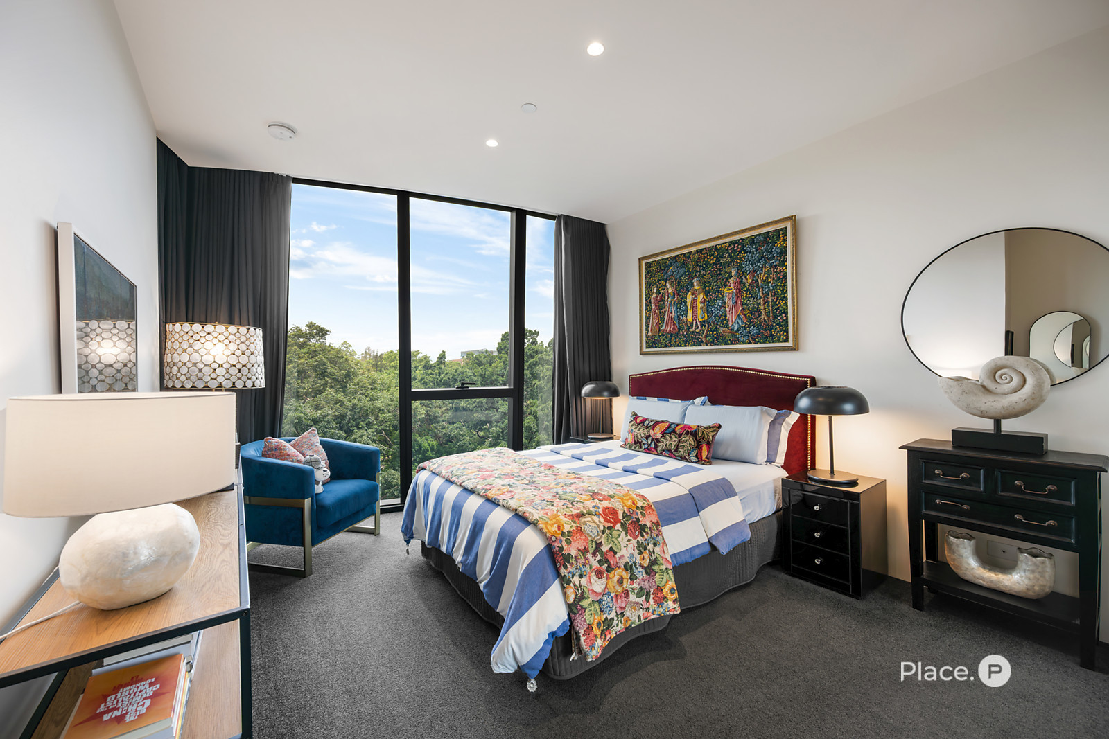 Bathed in natural light, the apartment enjoys lush, uninterrupted views across the Brisbane Botanic Gardens, framed by soaring floor-to-ceiling glass in both the living area and bedroom. The outlook creates a tranquil, leafy atmosphere that feels private and serene, while still being positioned in the heart of the city.