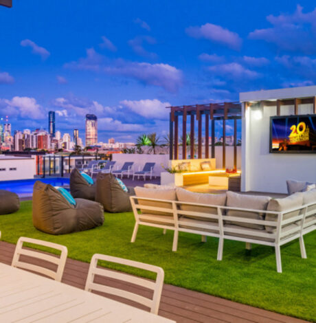 A highlight of living here is enjoying the complex’s outstanding rooftop entertainment area. Overlooking Brisbane’s cityscape, it showcases a sparkling swimming pool, an outdoor cinema, a barbecue area and fire pits.