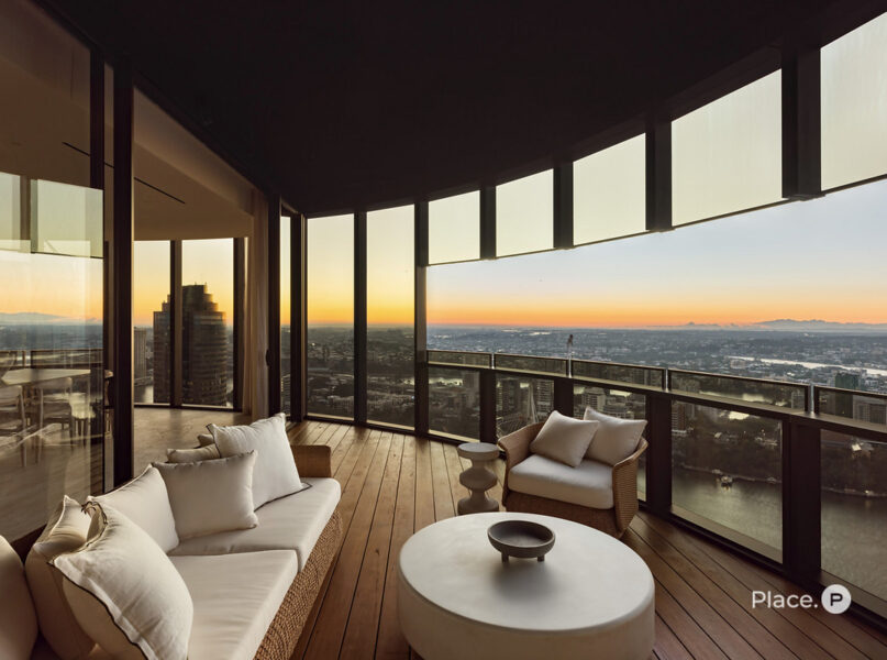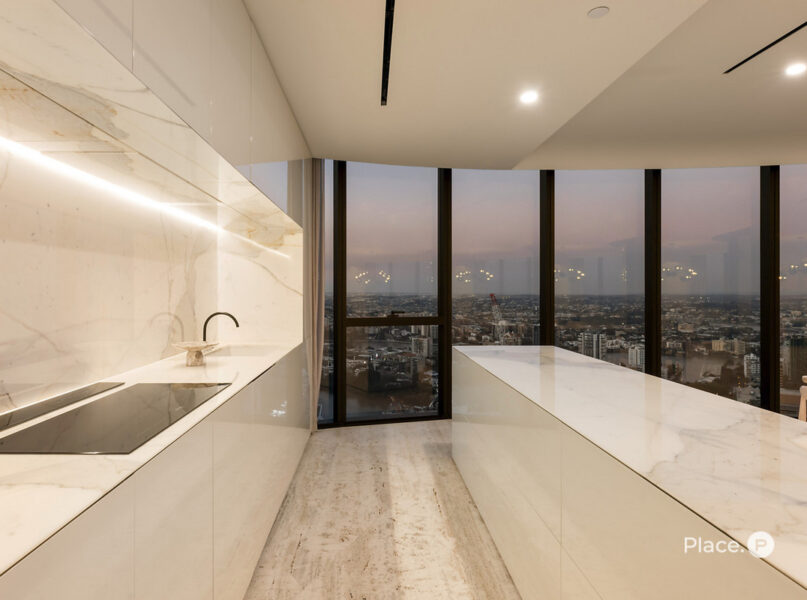 Ideal for relaxing and hosting guests in refinement, a spacious open-plan living and dining area greets you upon entry. Accompanied by two galleries providing over 10 linear metres for displaying artwork, this airy central space spills out onto an enclosed balcony. Commanding one of the city’s most mesmerising vistas, this extraordinary al fresco area is a true highlight for the residence.