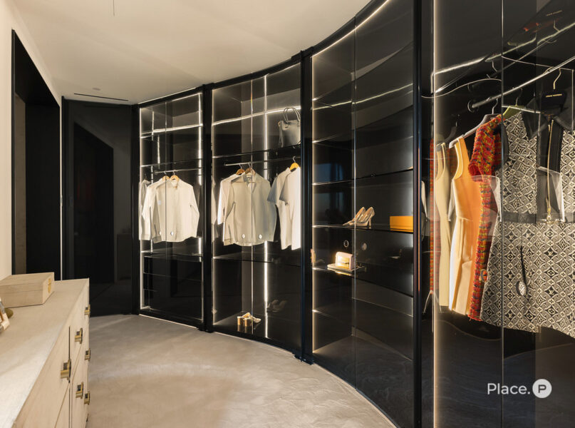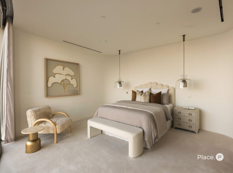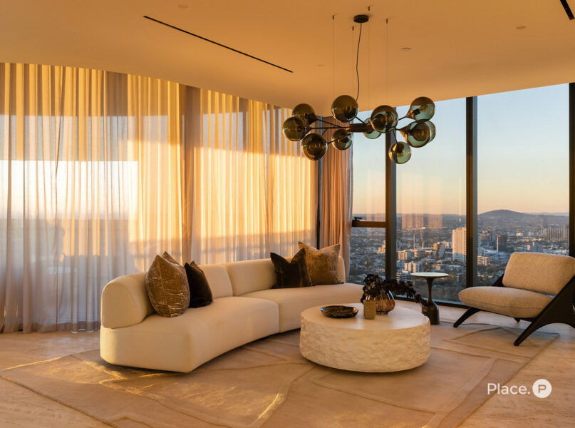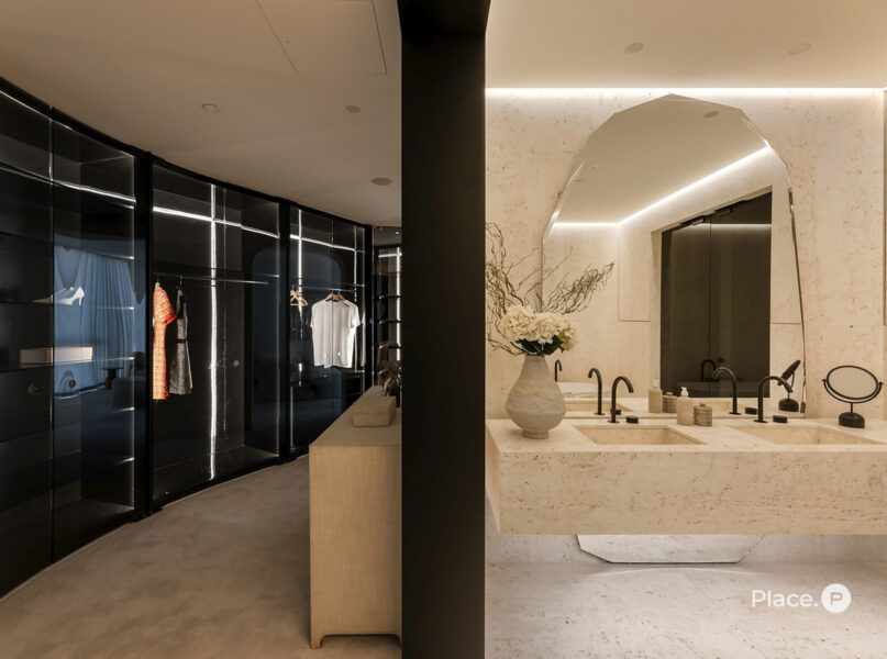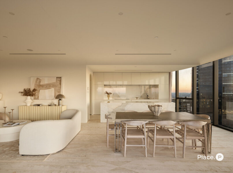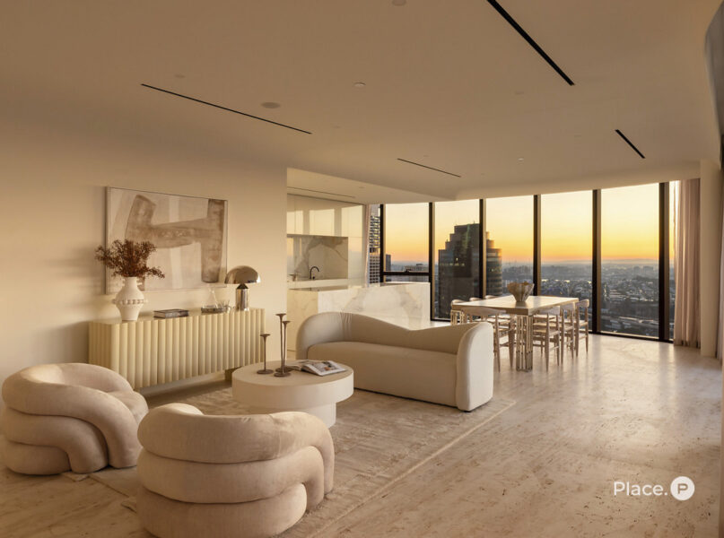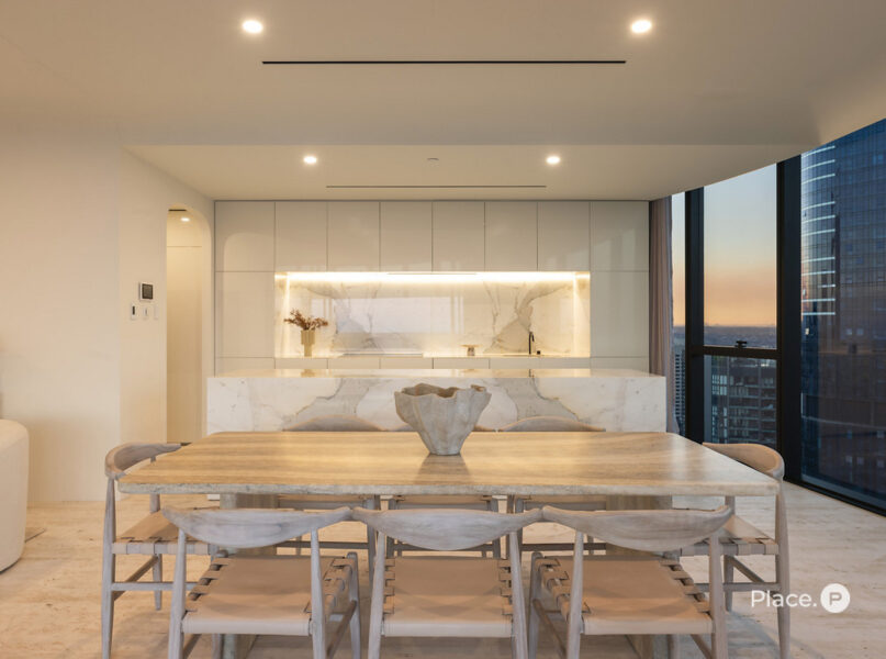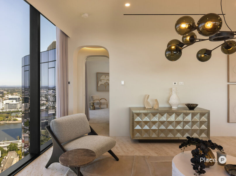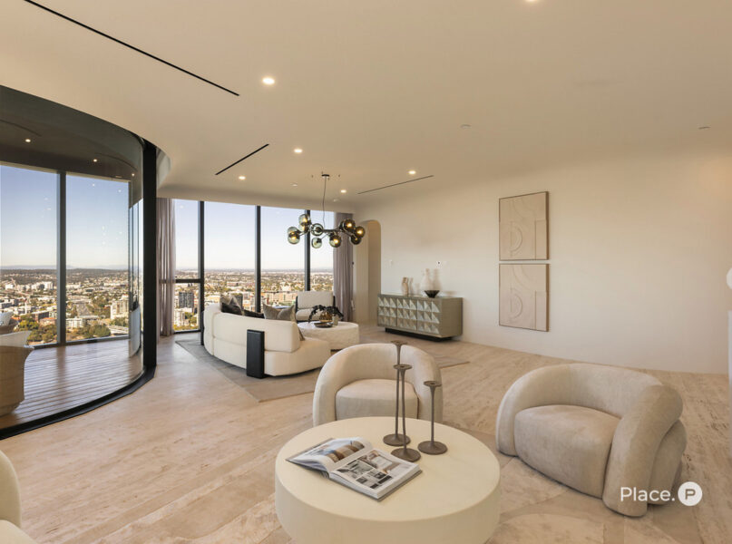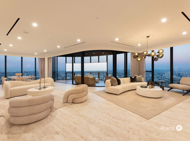 The residence is a testament to expert craftmanship. Encased in full-height glass that optimises natural light flow and stunning views, the apartment also showcases opulent custom laser-cut Italian travertine-tiled floors and Calacatta natural stone accents. A distinctive curvilinear design evokes a feeling of luxurious comfort, while custom joinery, Giorgetti light fittings and Flos Design flush-mounted lighting elevate the property’s interior.
