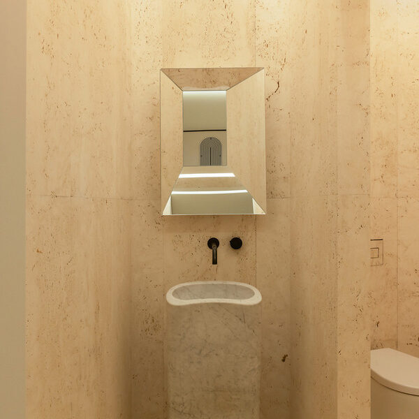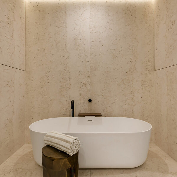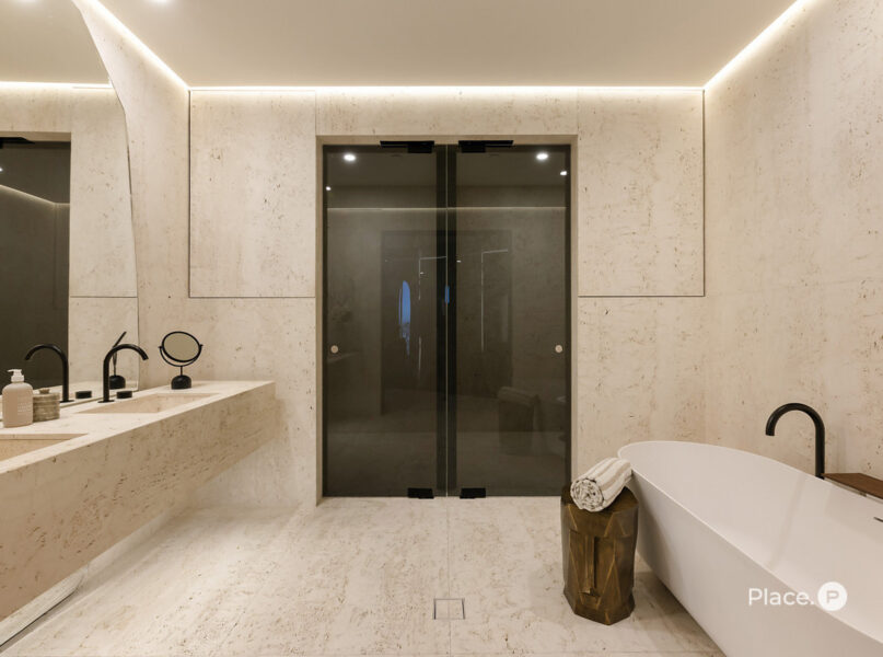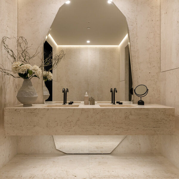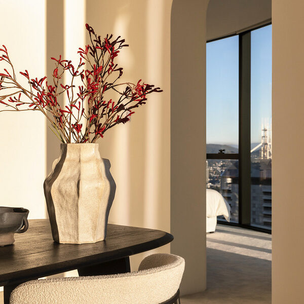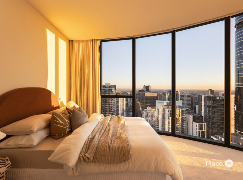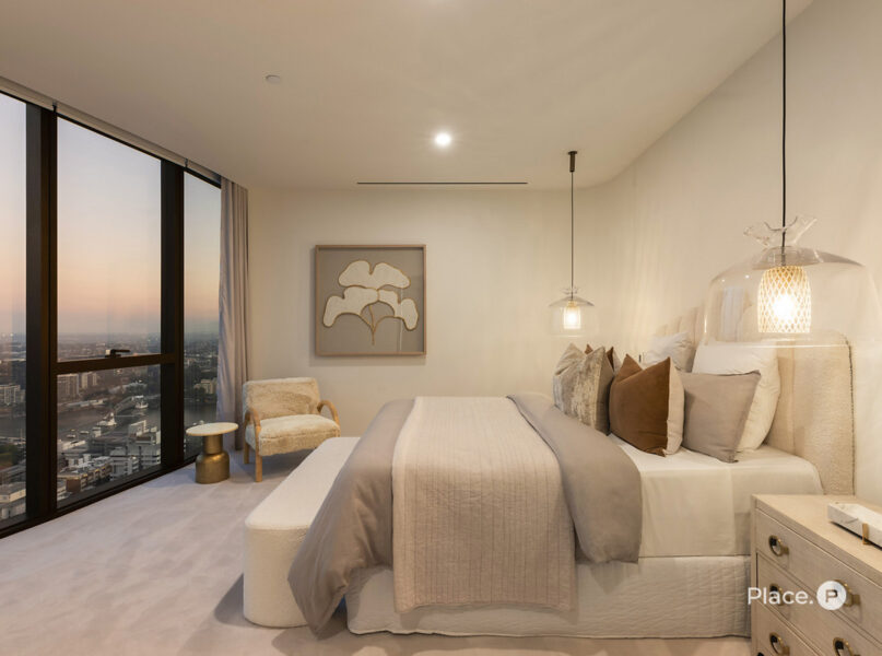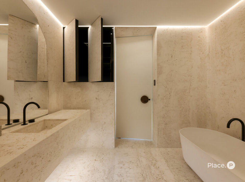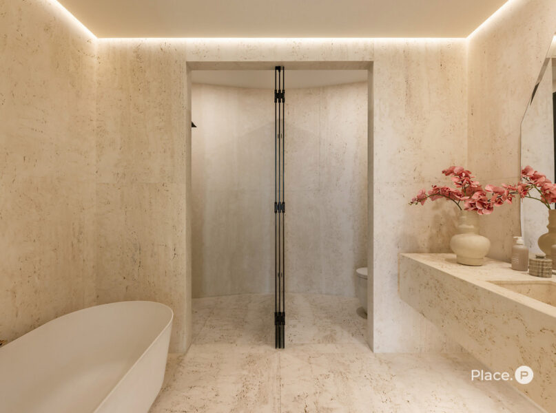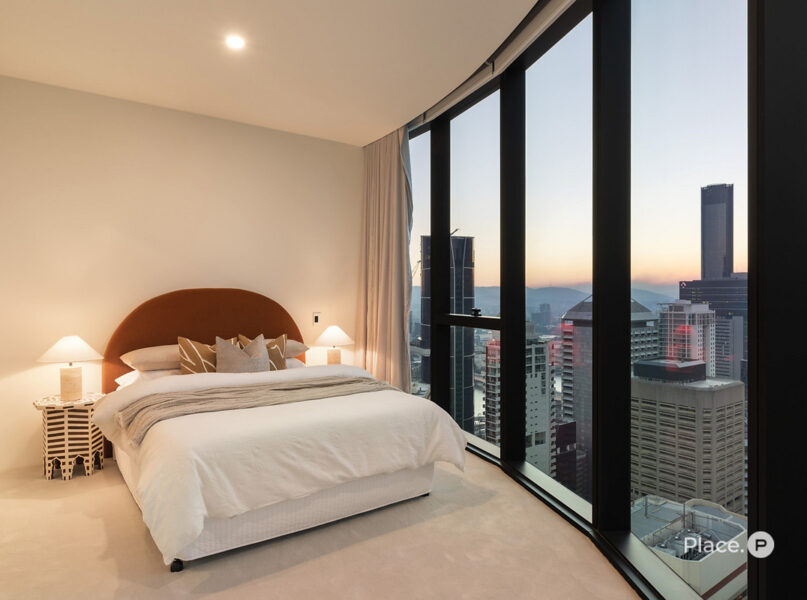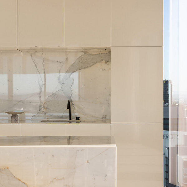 The residence is a testament to expert craftmanship. Encased in full-height glass that optimises natural light flow and stunning views, the apartment also showcases opulent custom laser-cut Italian travertine-tiled floors and Calacatta natural stone accents. A distinctive curvilinear design evokes a feeling of luxurious comfort, while custom joinery, Giorgetti light fittings and Flos Design flush-mounted lighting elevate the property’s interior.