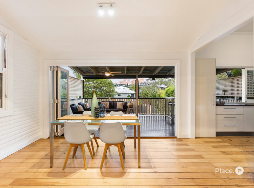 Encouraging indoor-outdoor living, timber bi-fold doors open out to a covered rear deck that lends itself to al fresco meals, barbecues and afternoon drinks.