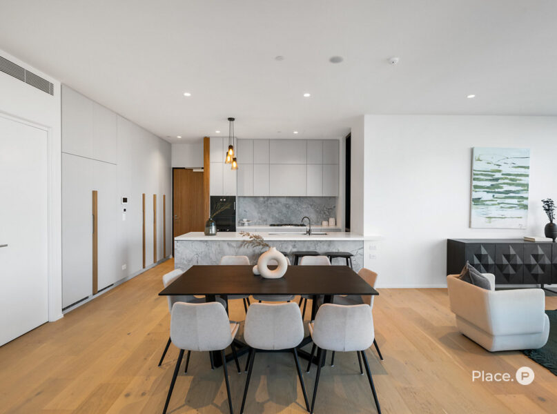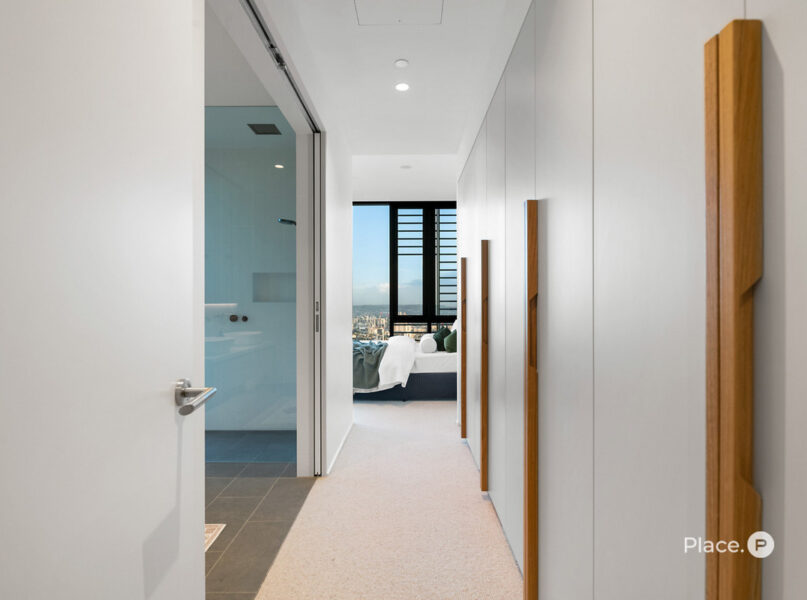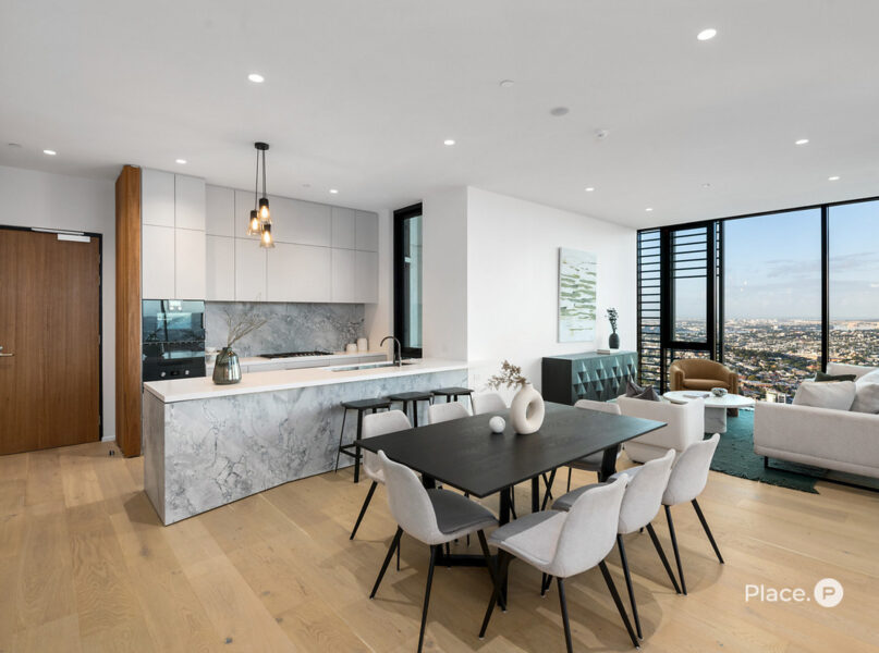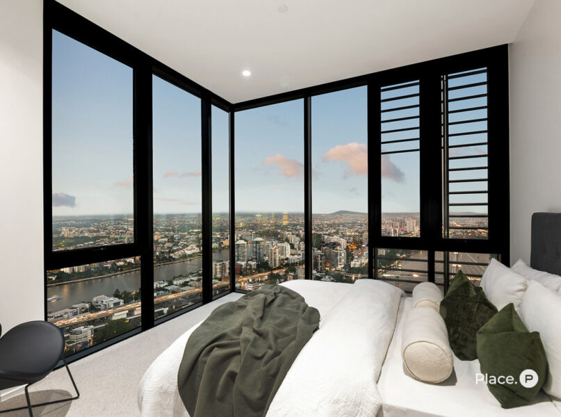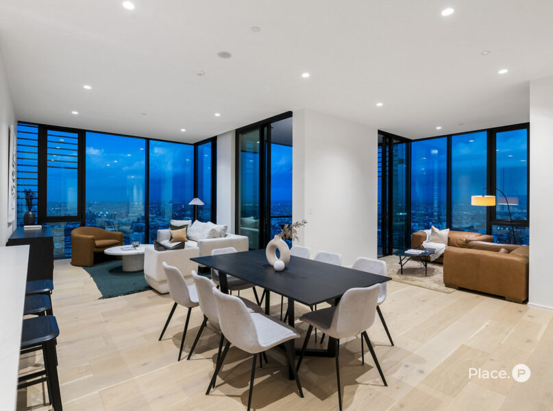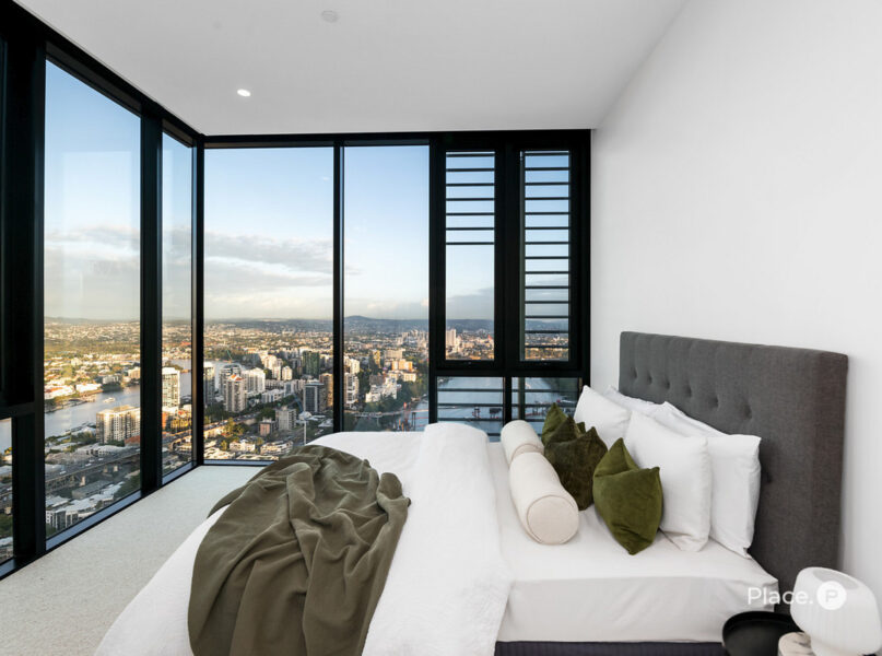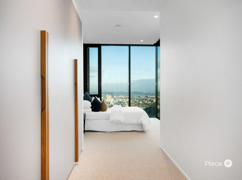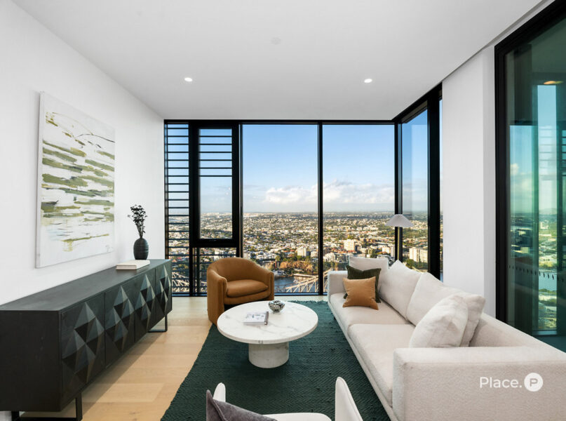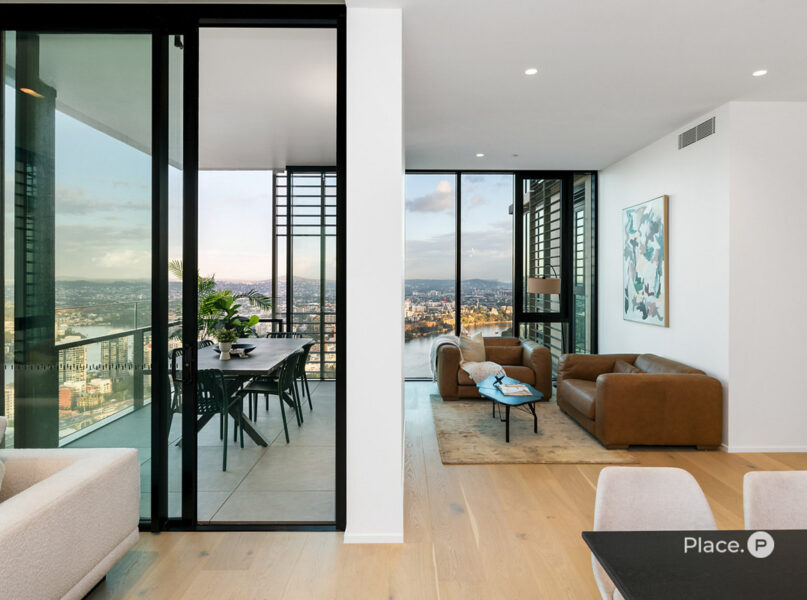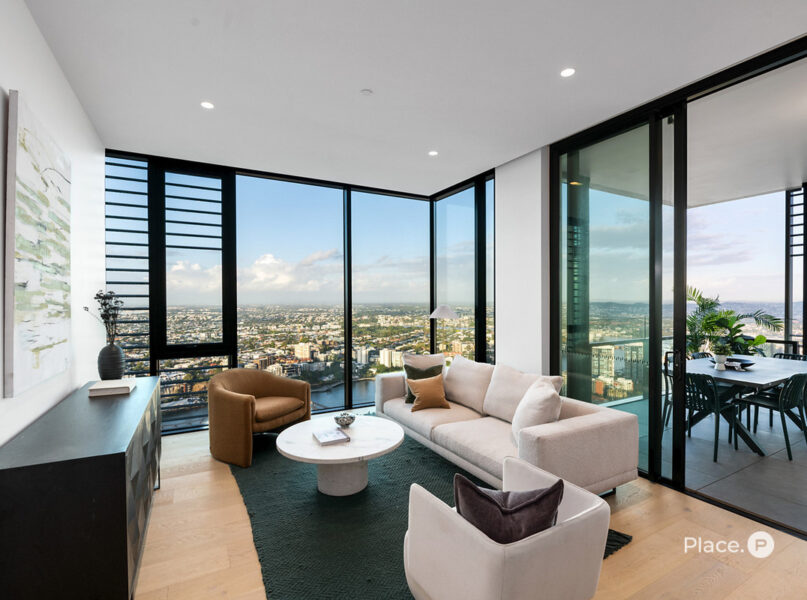 Set within the renowned 443 Queen Street address, the residence celebrates modern elegance with timber floors, natural stone accents and lofty three-metre-high ceilings throughout. Plentiful full-height glass highlights the phenomenal outlook, while also maximising natural light.