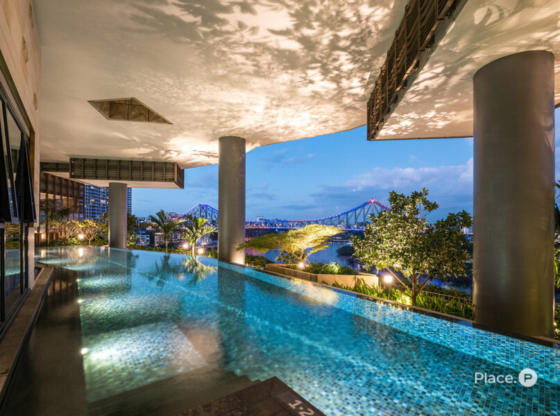Complete with a powder room and an internal laundry with a separate drying room, the property also includes ducted air-conditioning, intercom security, seamlessly concealed storage, a separate on-title storage cage and arguably the building’s best side-by-side parking for two cars positioned on the first level of the residents’ parking areas with views of the Story Bridge. Designed by internationally acclaimed studio WOHA in collaboration with the renowned local design firm Architectus for Brisbane’s subtropical climate, the complex offers the use of its twenty five metre riverside infinity pool, yoga terrace, cabana lounge areas, fitness centre, barbecue deck, formal dining/kitchen spaces, communal gardens and terraces.