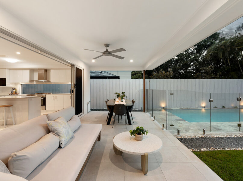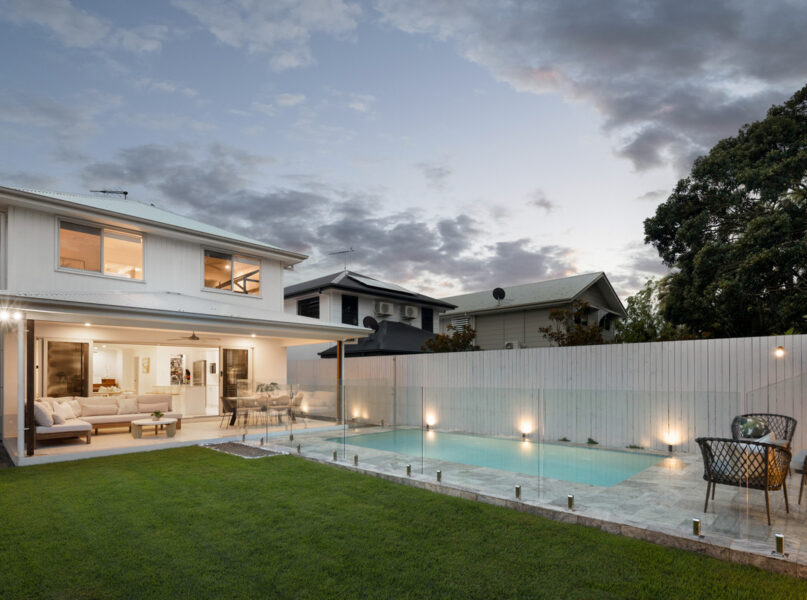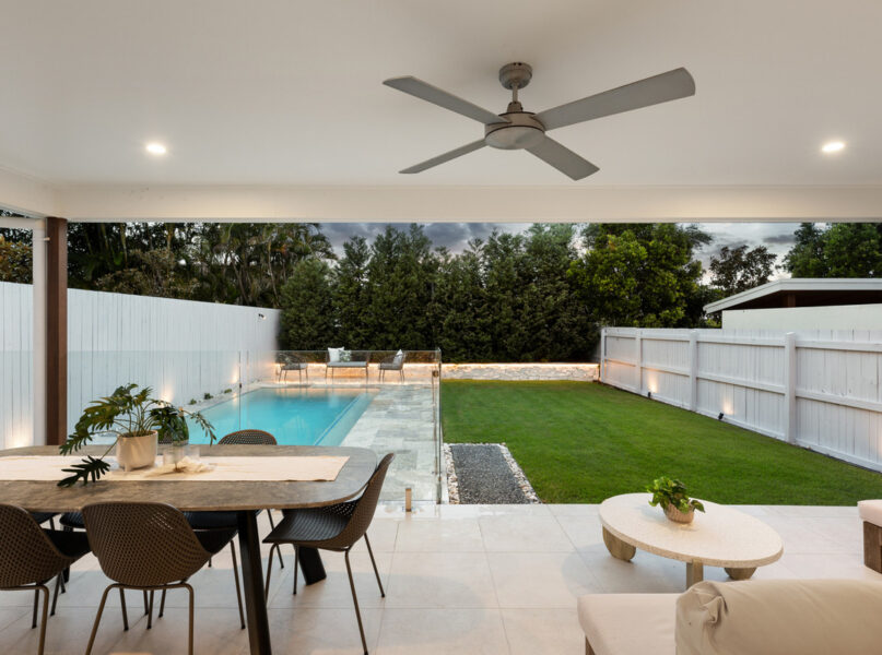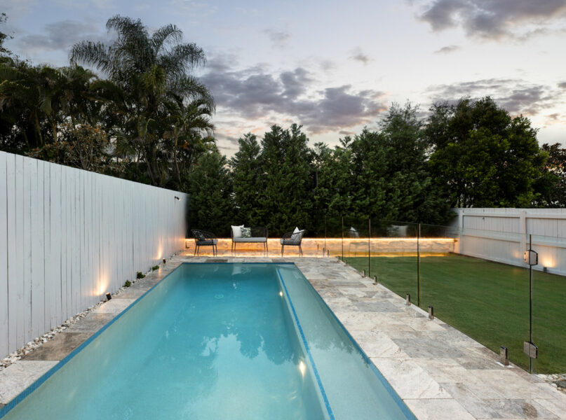 Outside, you’ll find a backyard oasis, a haven for outdoor enjoyment. Here, you’ll find a covered al-fresco area which gently cascades to a beautiful pool area decked out with French pattern travertine tiling, an in-ground mineral pool, a sunbathing area – perfect for the Brisbane weather, and a hot & cold shower, all of which is encased by plate glass pool balustrades with stainless steel spigots. Giving the best of outdoor entertainment, you’ll also find ample space for sports with a sizeable, grassed area.