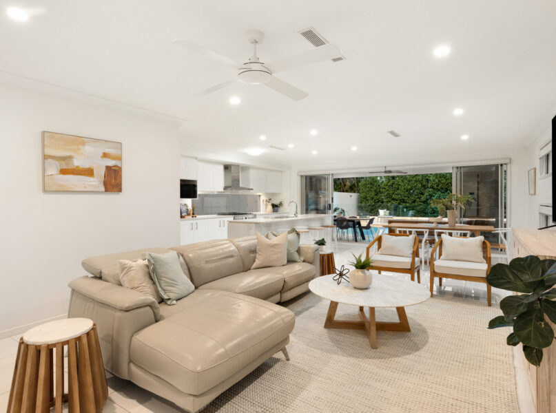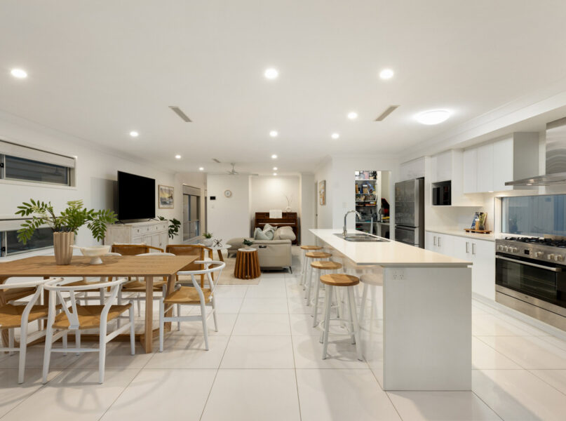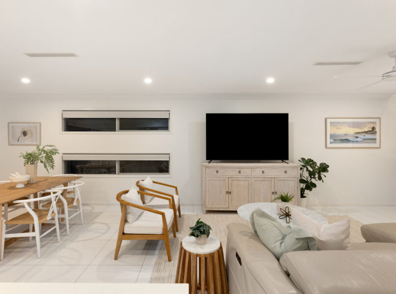 As you enter, you’re greeted by the smart two-story design, offering diverse living and entertaining spaces. The lower level unfolds with a spacious open-plan living, kitchen, and dining area, seamlessly extending outside through stacker doors which extend the full width of the property, to an elevated al-fresco area, a level grassed backyard, and a gorgeous pool area fitted out with a mineral pool, this truly is a home for entertainers and families alike.