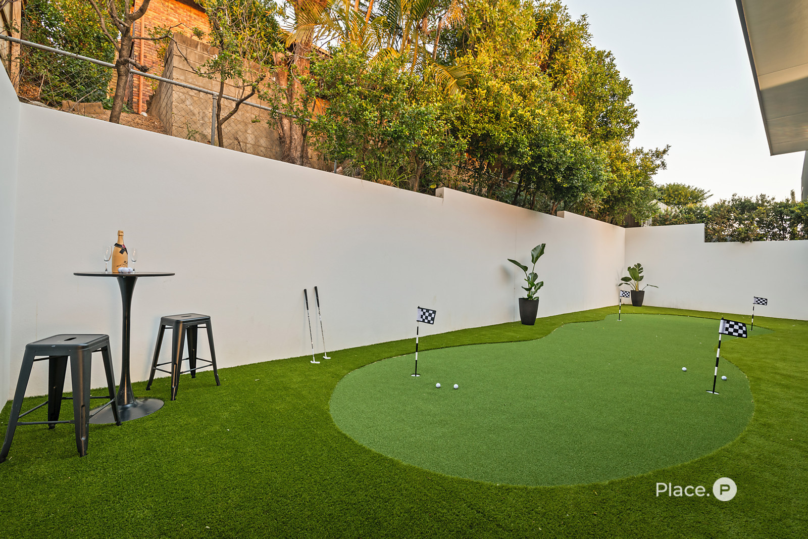 Upstairs, unwind on the upper terrace complete with putting green, or step onto balconies that frame the skyline beyond — a daily reminder of the privileged position this property holds. Multiple bedrooms include luxury bathroom ensuites and walk-in robes, with high ceilings and custom finishes adding refined touches throughout.