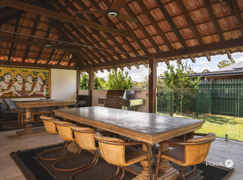 Finishing the home’s upper level is an ensuited master bedroom encompassing a walk-in robe, as well as another ensuited bedroom. Three additional bedrooms with built-in robes downstairs are accompanied by a well-appointed main bathroom and a separate laundry. Other notable details include two secure dual garages, two secure single garages, undercover parking for another two cars, fabulous storage, ceiling fans, ducted air-conditioning and two outdoor showers.