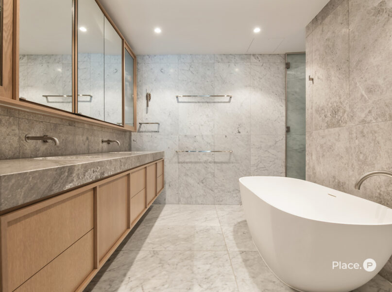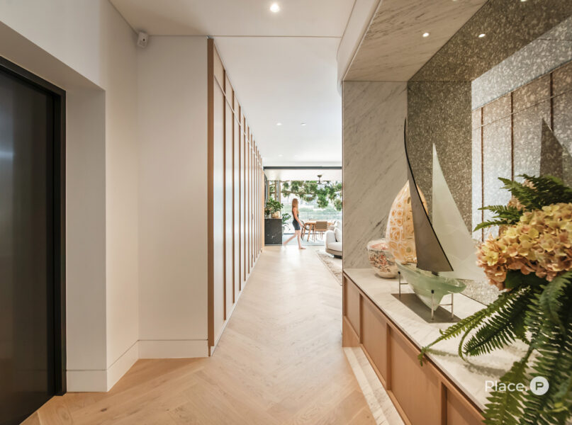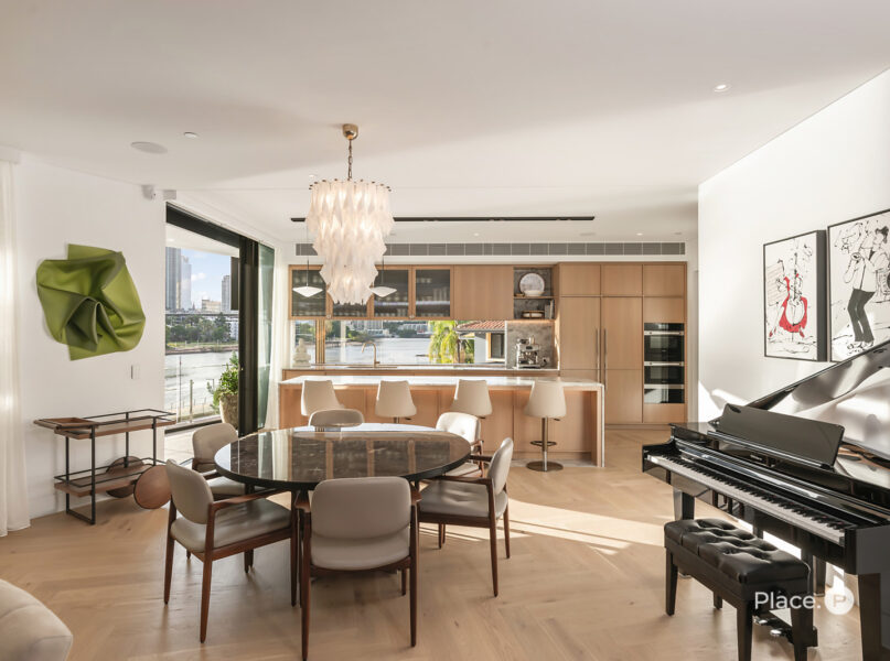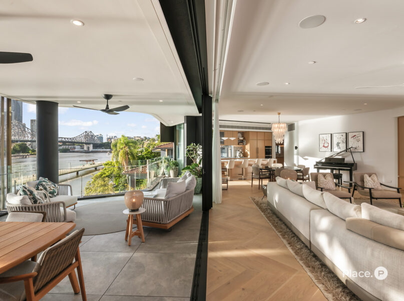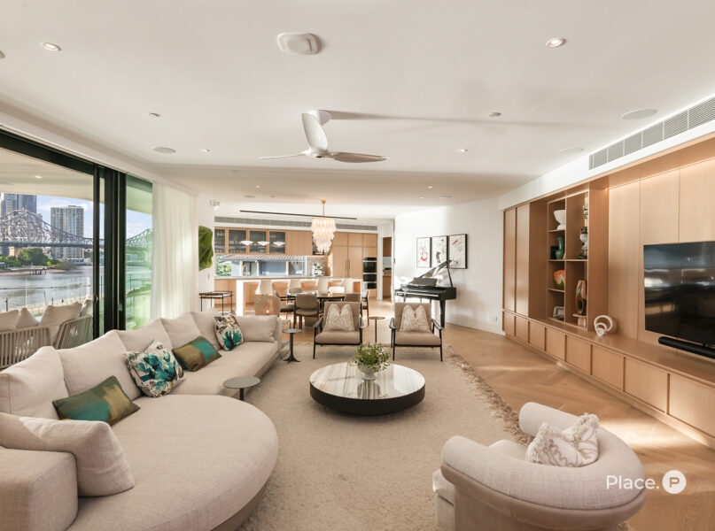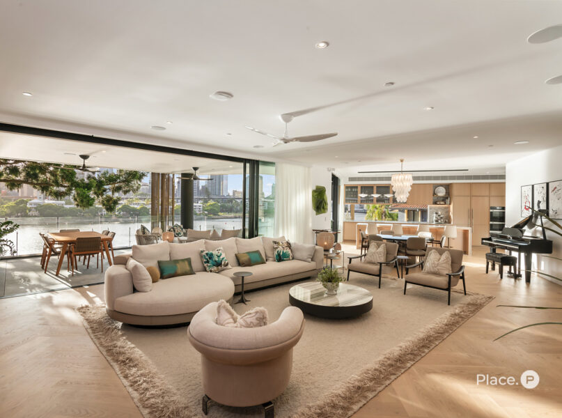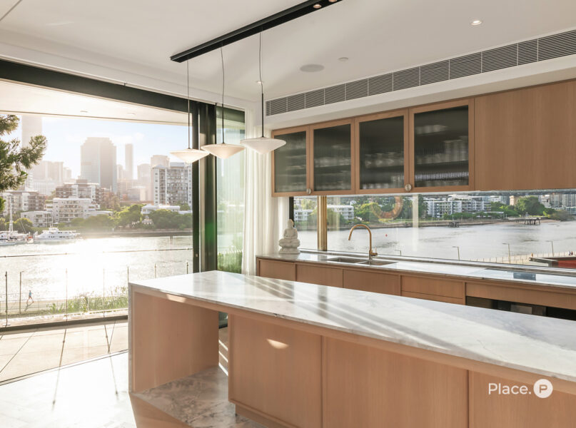 Timeless and refined, the residence spanning approx. 326sqm is ideally positioned on a coveted stretch of the Brisbane River. Framed by full-height glass that draws your eye to the mesmerising vista, the apartment also showcases exquisite herringbone timber floors and stone accents.