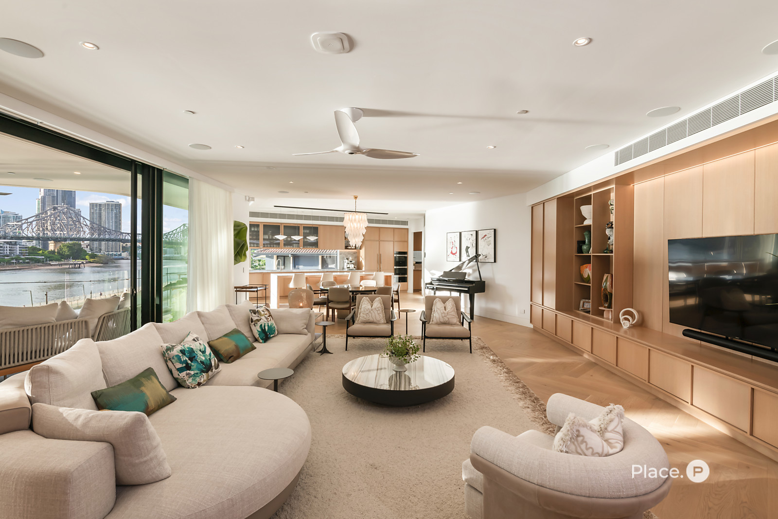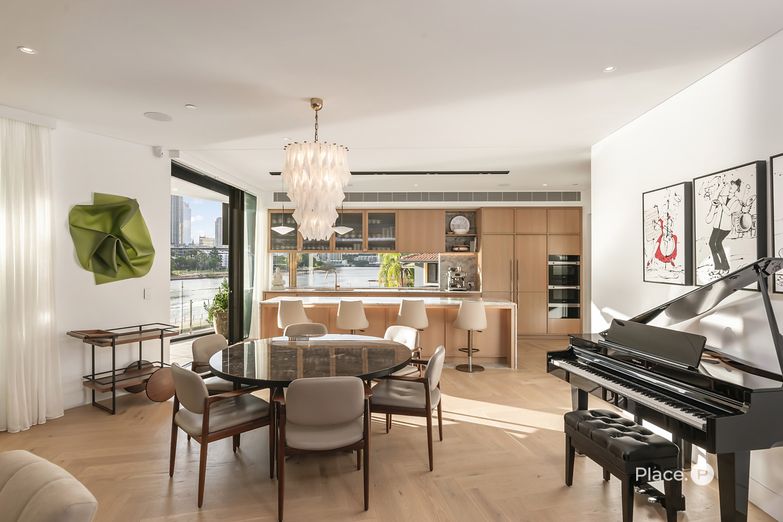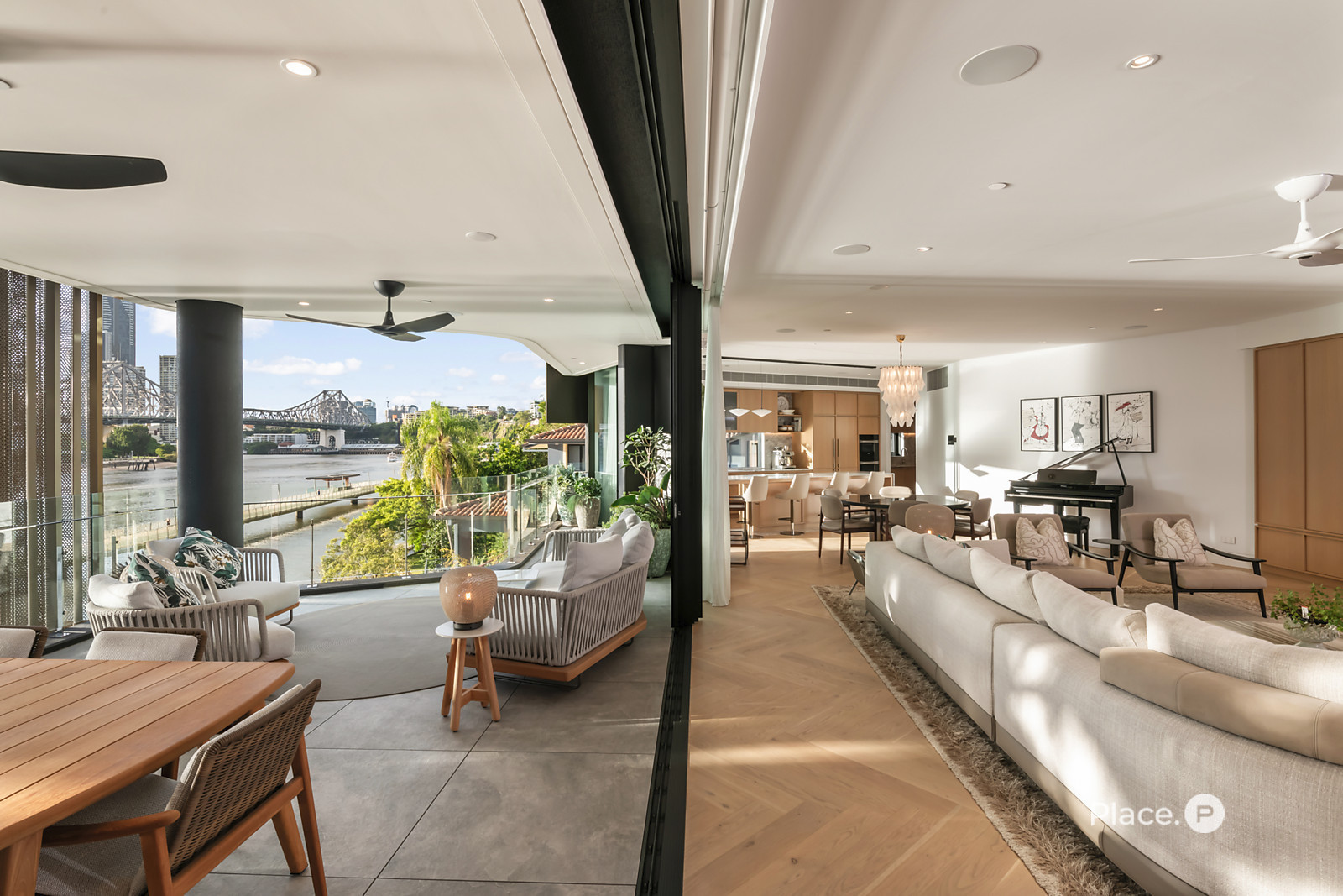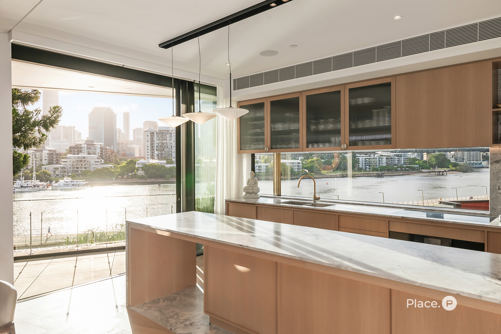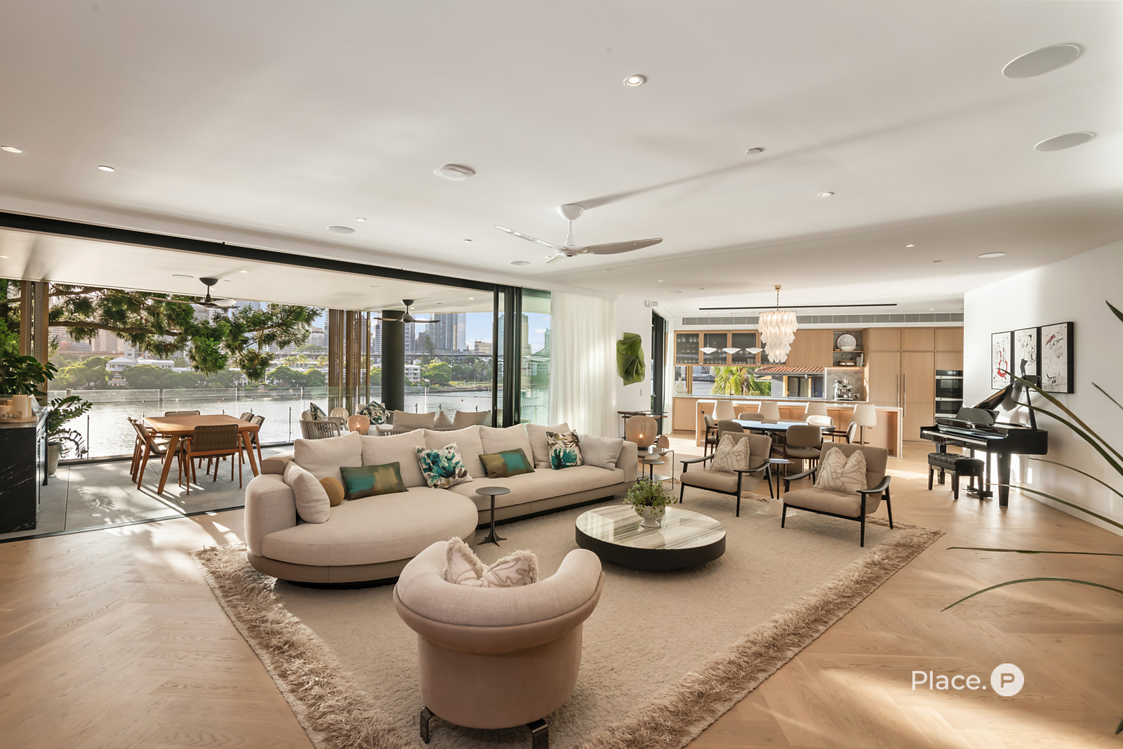 Timeless and refined, the residence spanning approx. 326sqm is ideally positioned on a coveted stretch of the Brisbane River. Framed by full-height glass that draws your eye to the mesmerising vista, the apartment also showcases exquisite herringbone timber floors and stone accents.